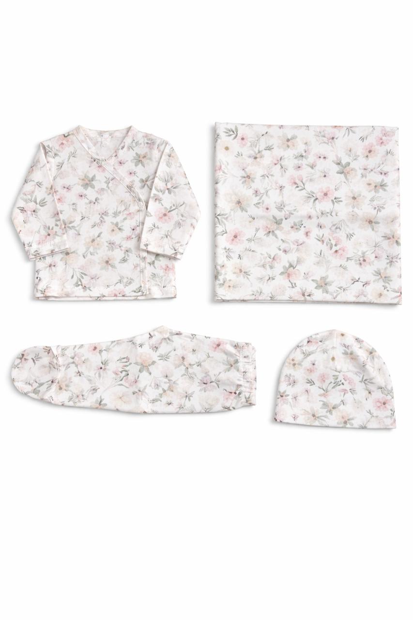 Ajuar de algodon estampado, manta, ranita, batita y gorro.