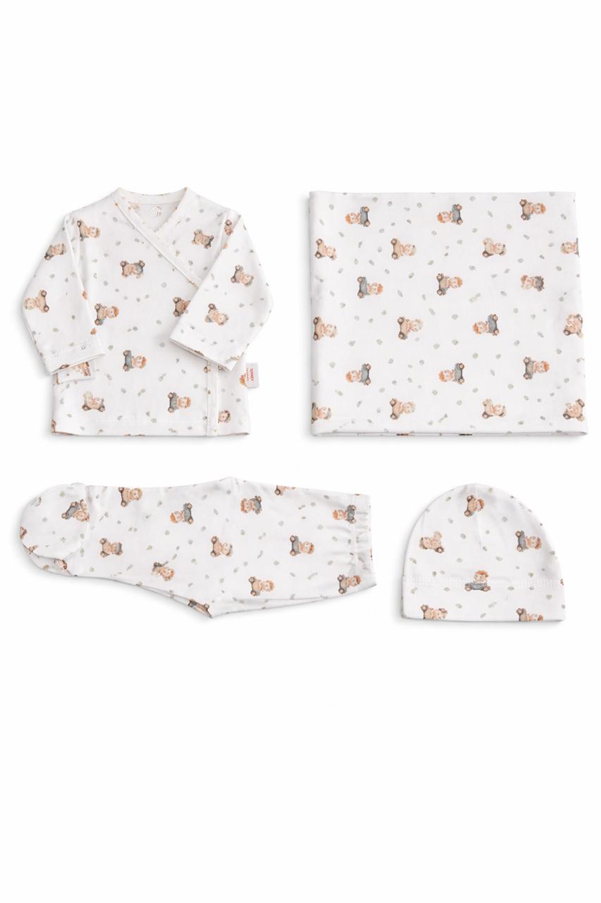 Ajuar de algodon estampado, manta, ranita, batita y gorro.