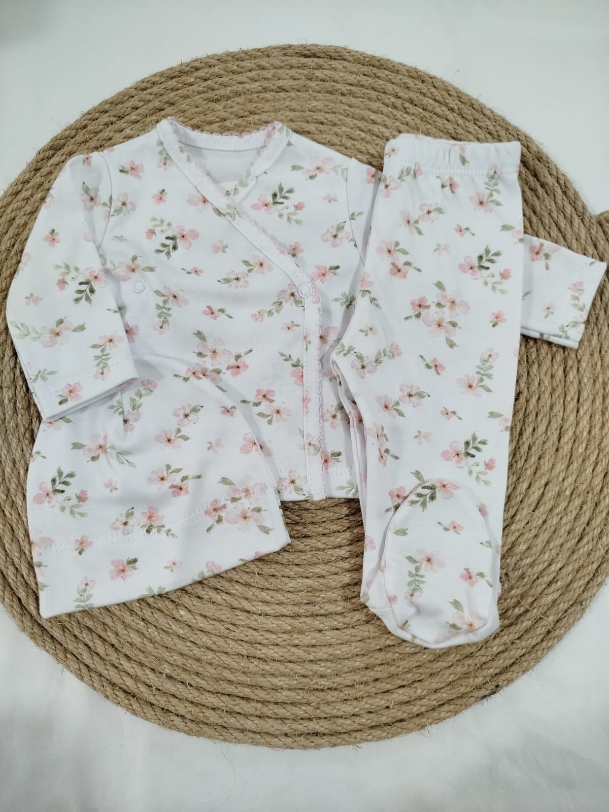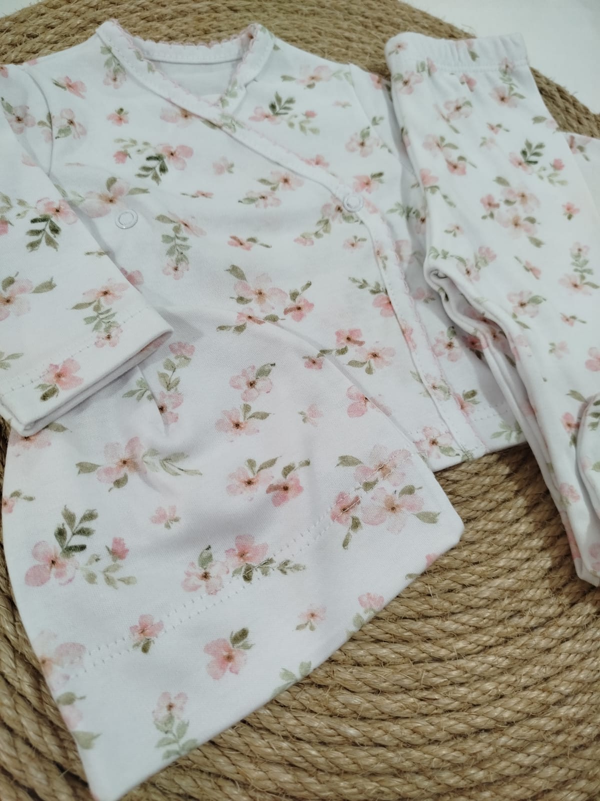 Batita, ranita y gorro de algodón estampado. La batita cuenta con broche para su cerrado.