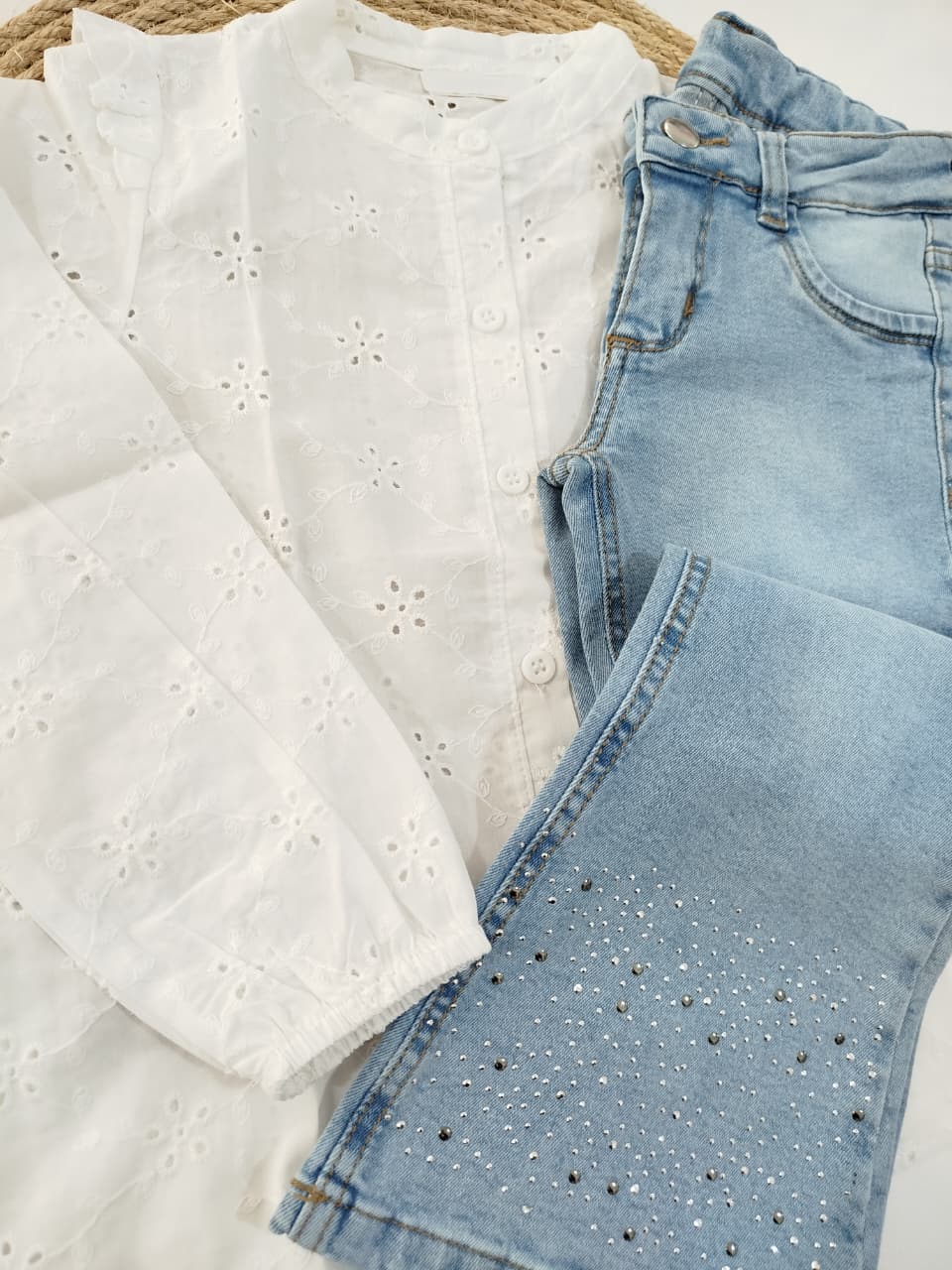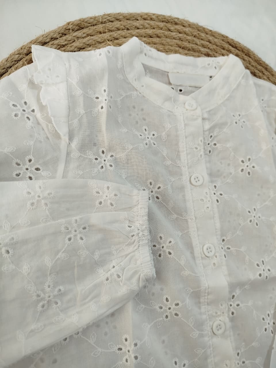 Camisa de broderie mangas largas, con voladitos en el hombro.