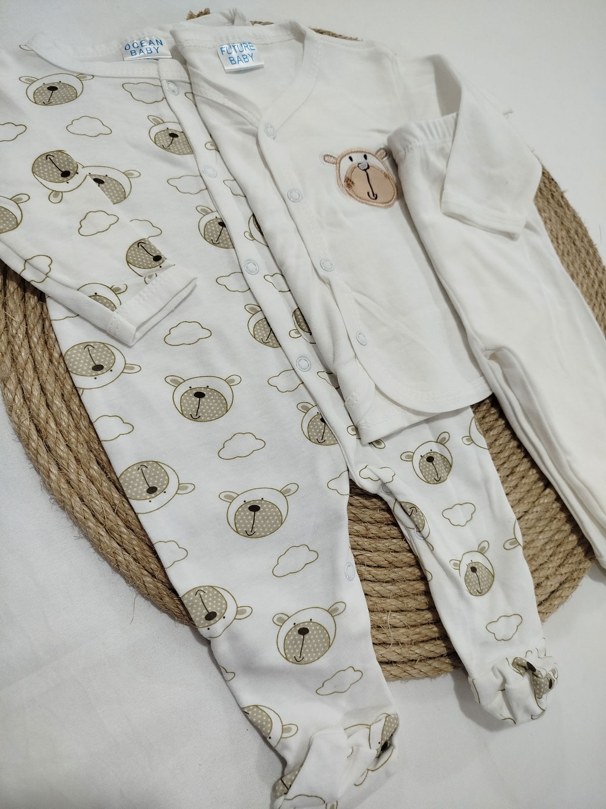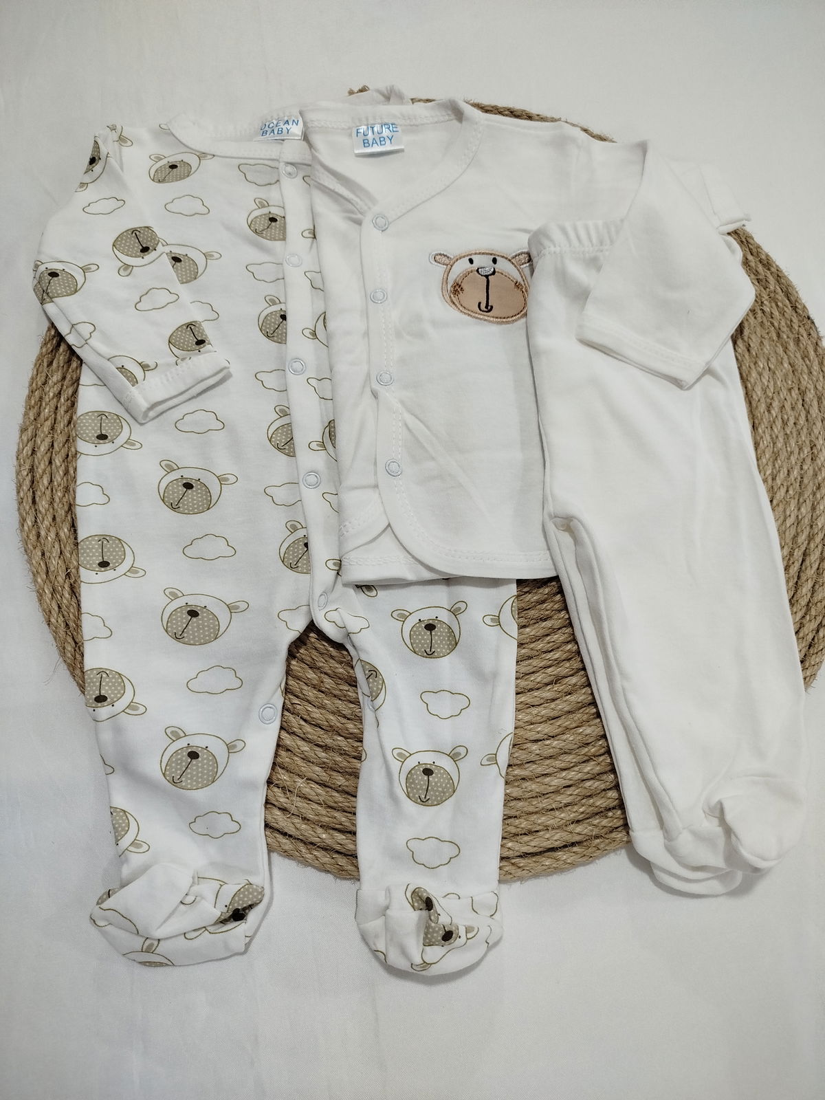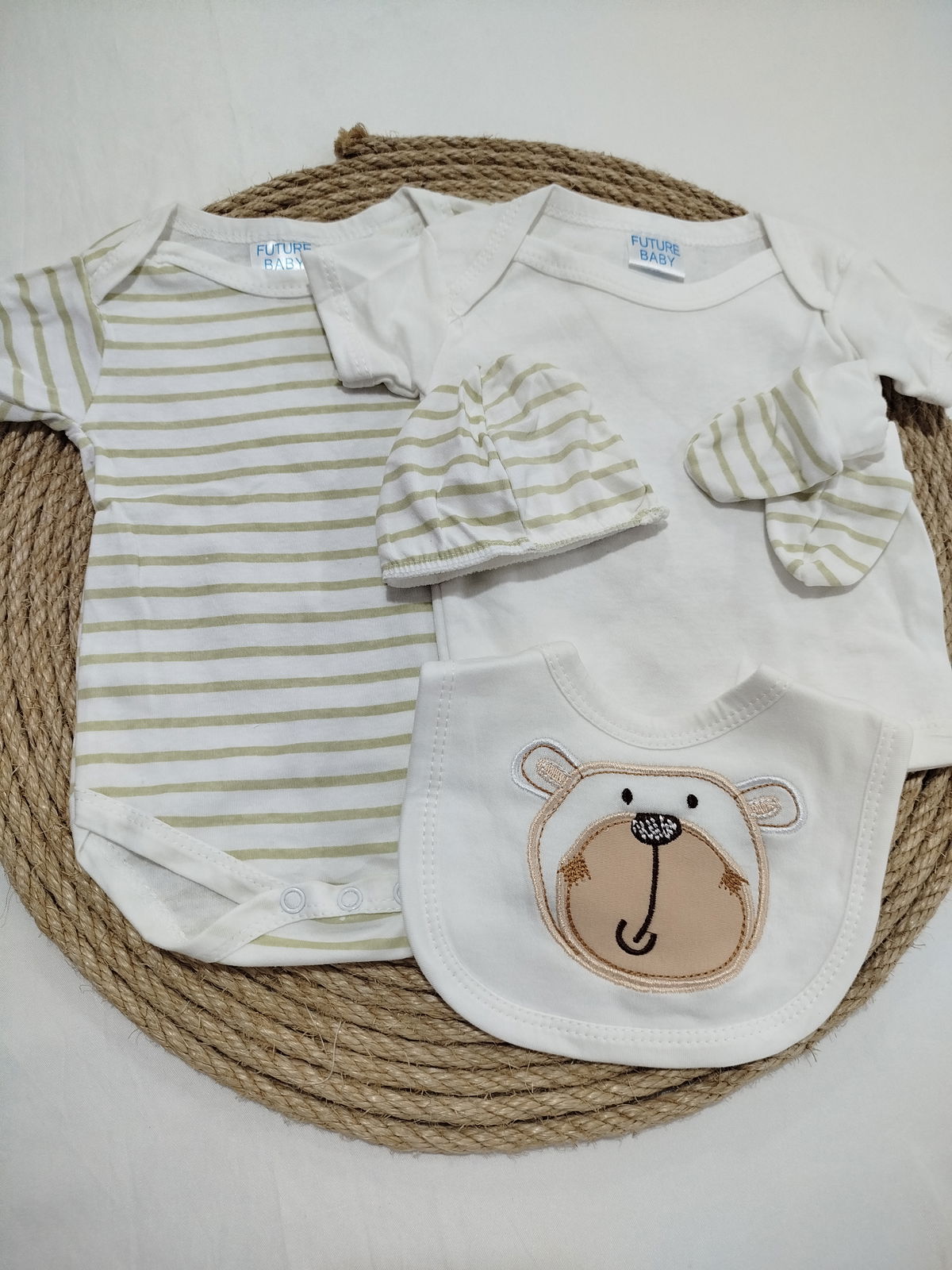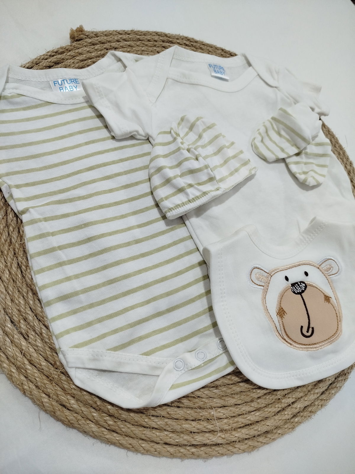 Conjunto de algodón. Compuesto por 8 piezas; campera, ranita, remera mangas cortas, enterito mangas largas, body mangas cortas, gorro, mitones y babero.