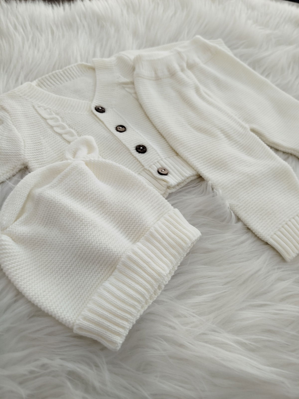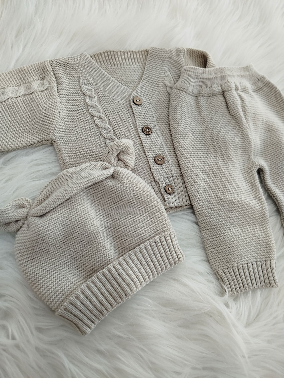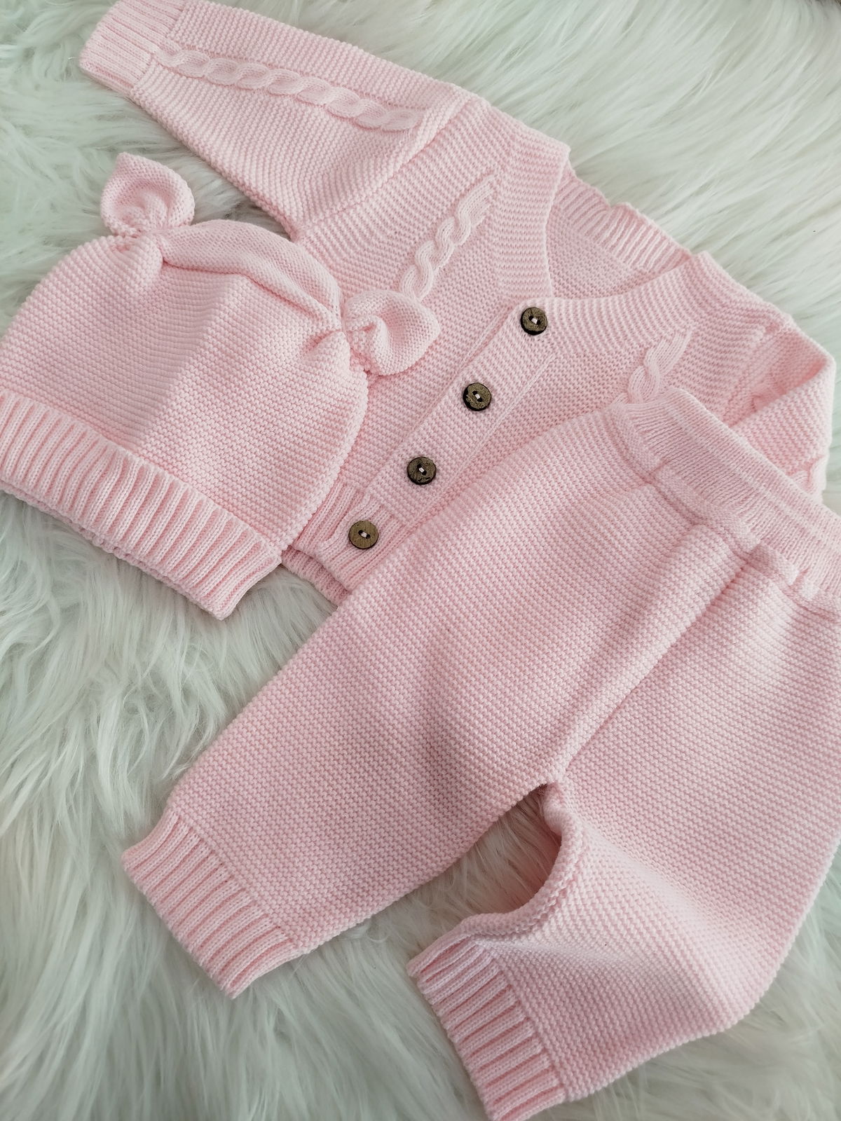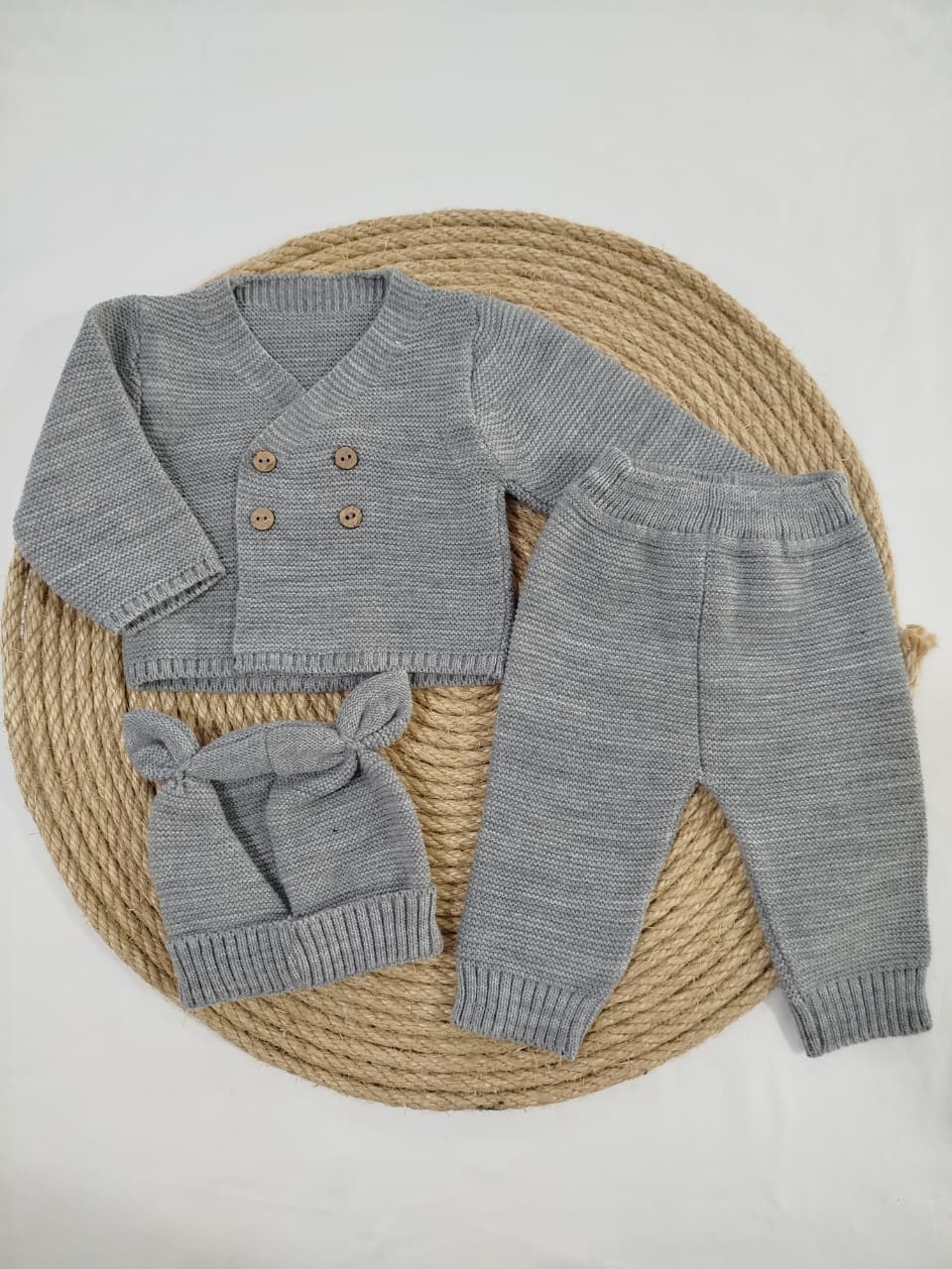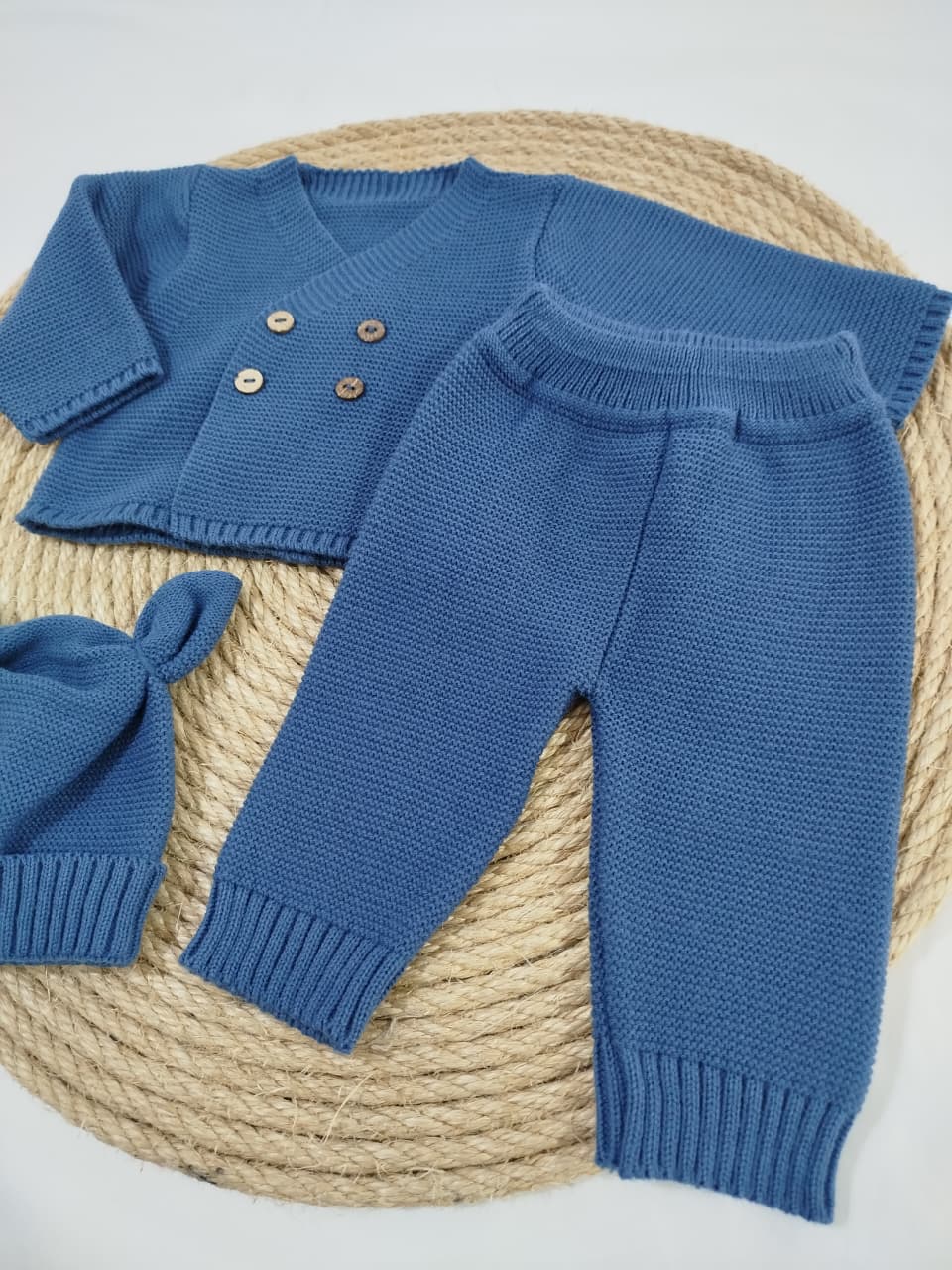 Ajuar tejido 3 piezas. Campera, pantalón y gorro.