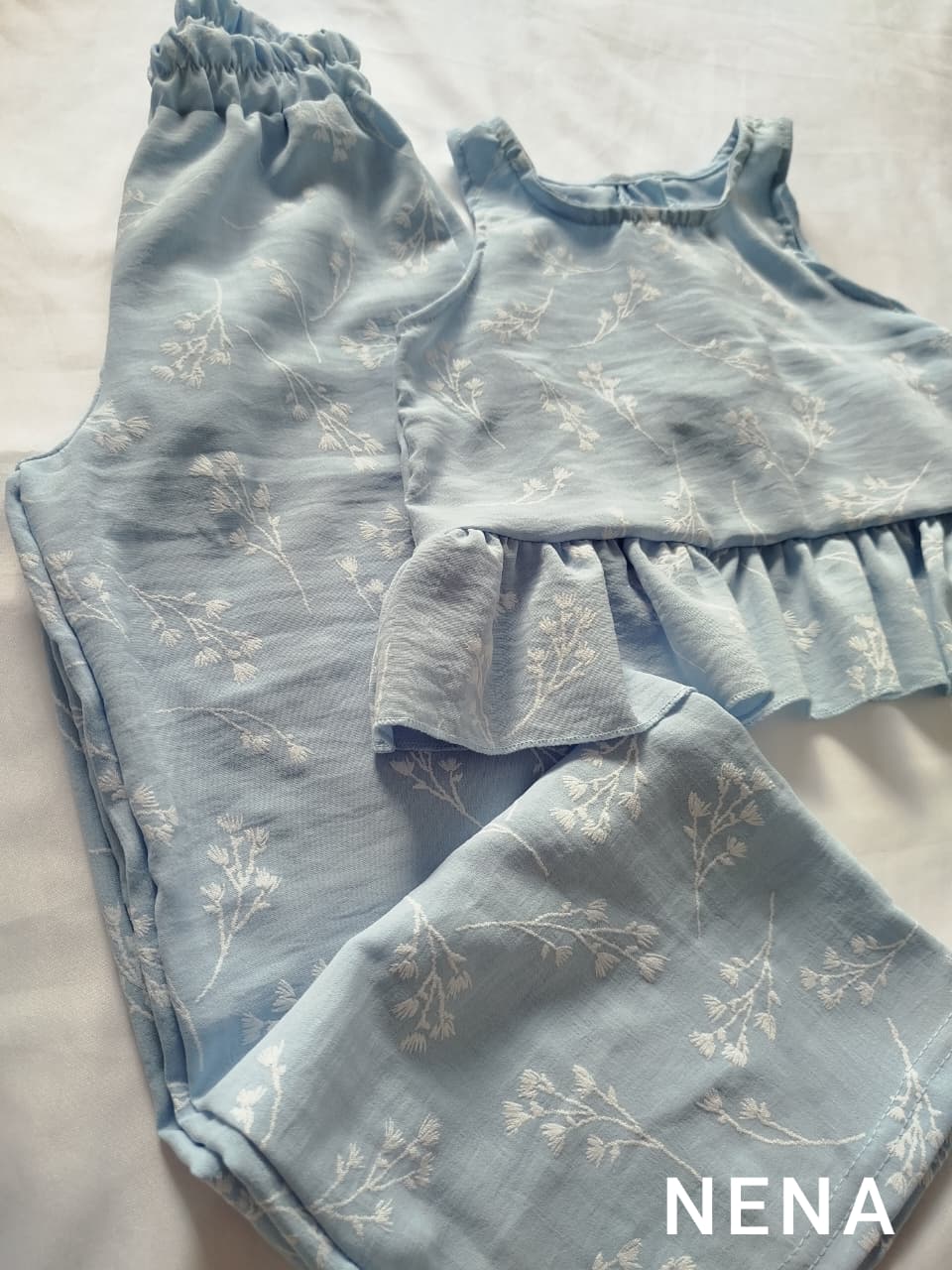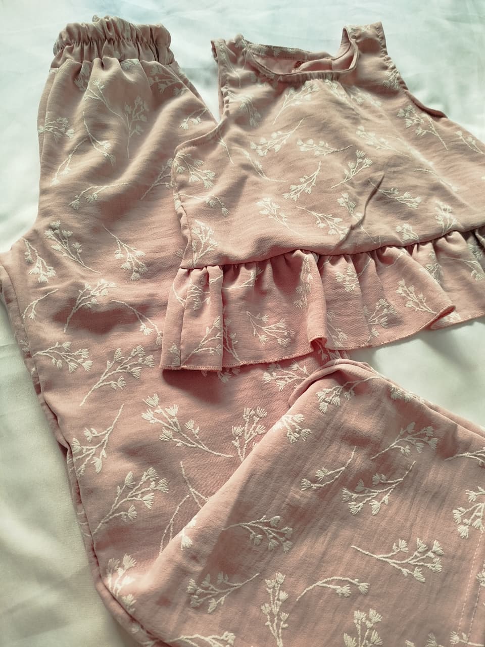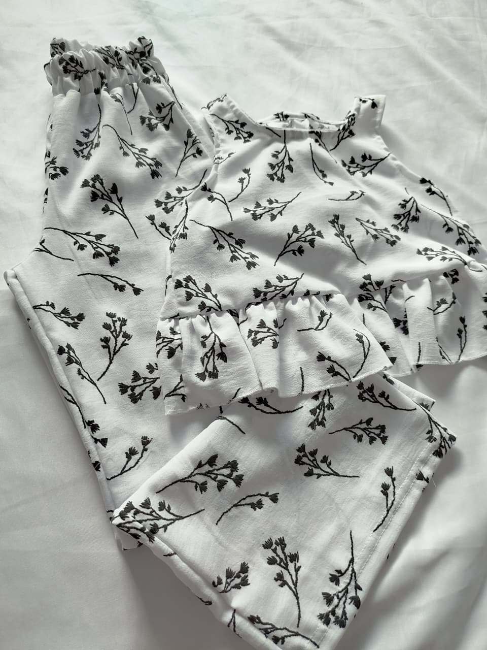 Conjunto palazo con blusa de cey, con escote en la espalda.