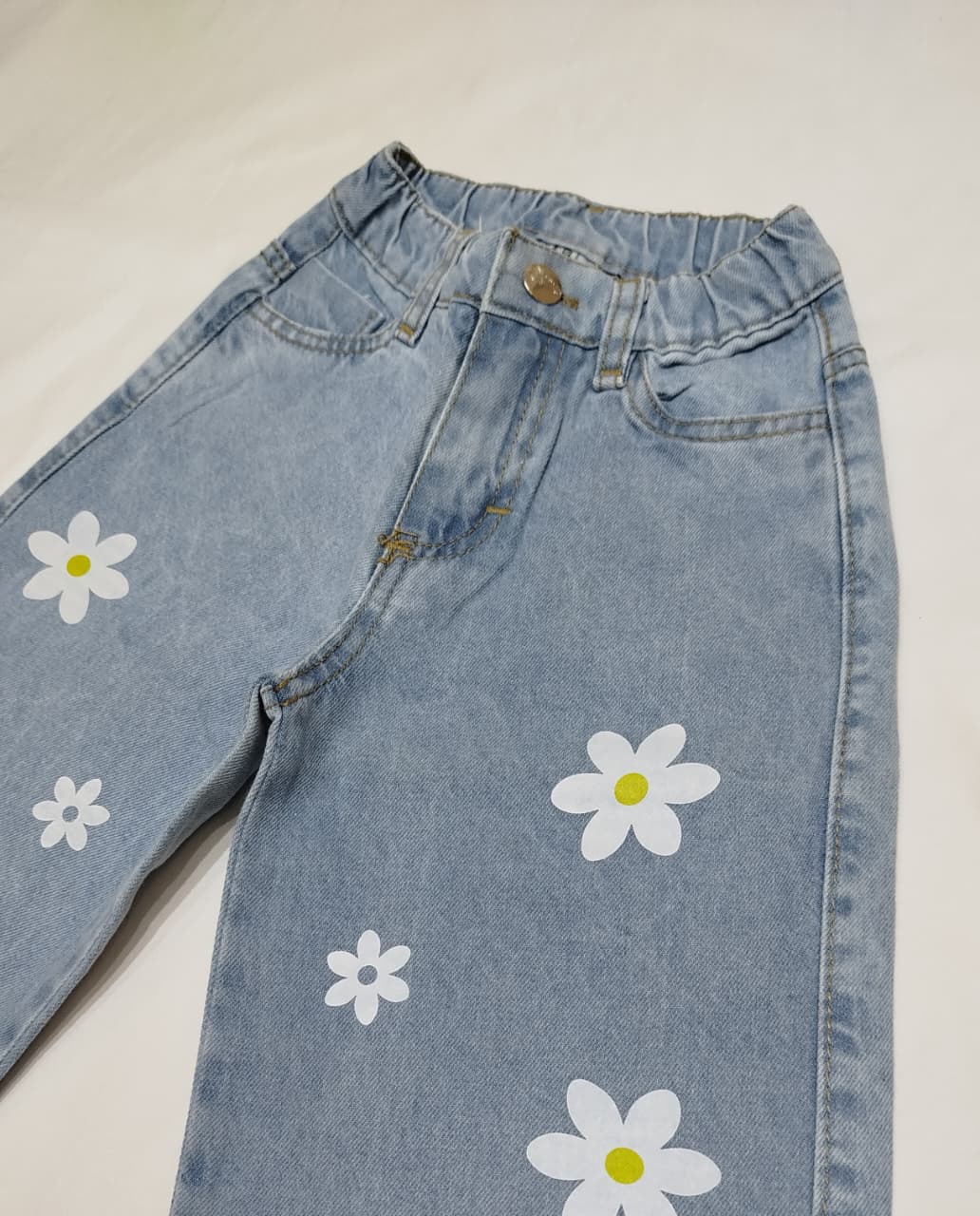 Jean wide leg con cintura elastizada en la parte de atrás, con estampa de margaritas.