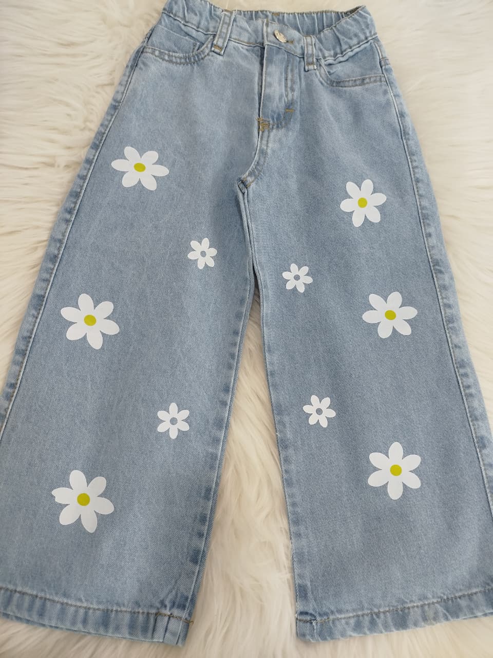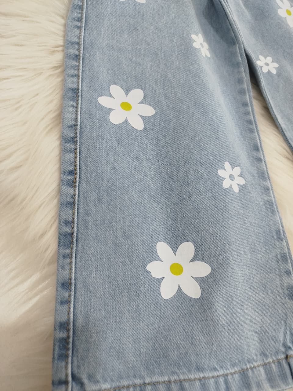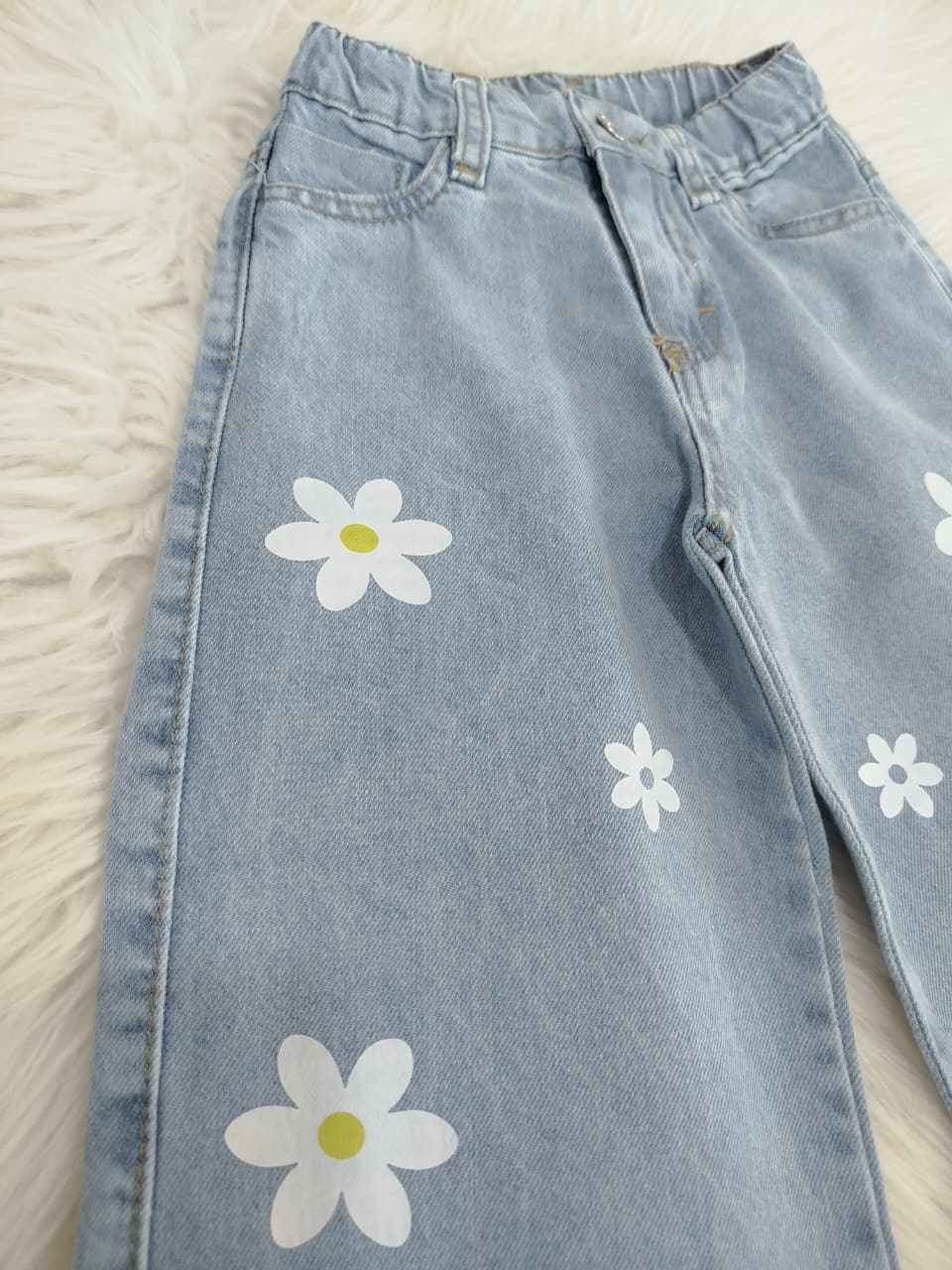 Jean wide leg con cintura elastizada en la parte de atrás, con estampa de margaritas.