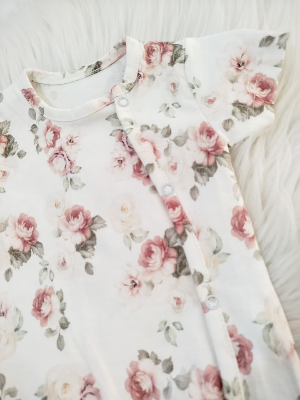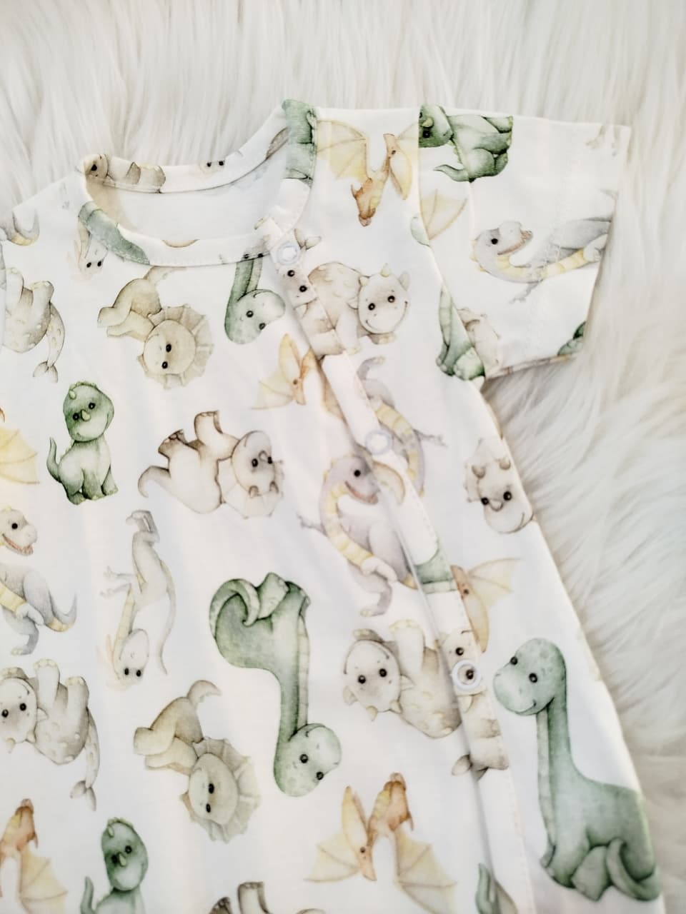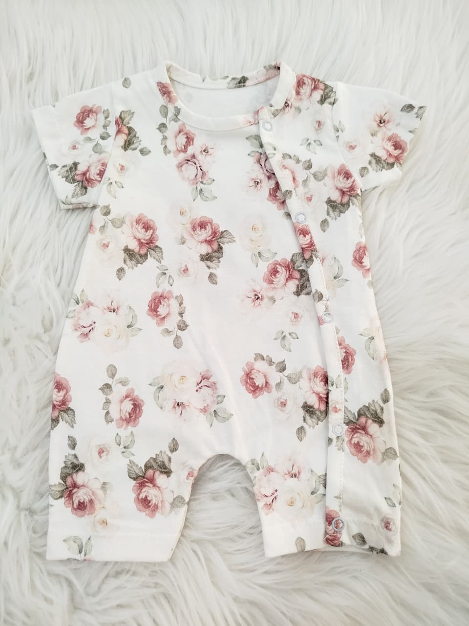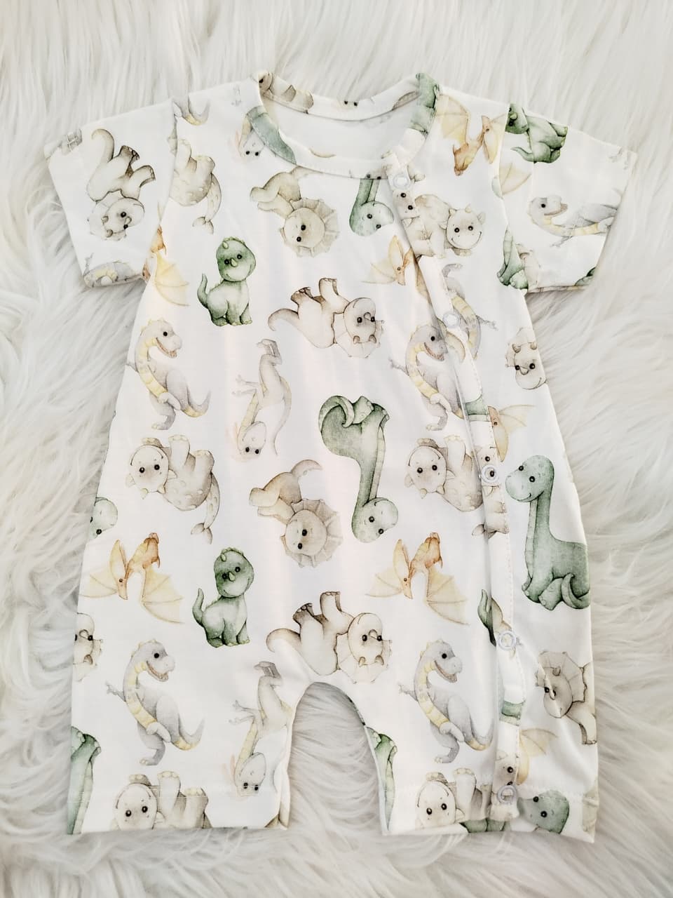 Enterito corto de algodón estampado. Con broches en la parte delantera izquierda.