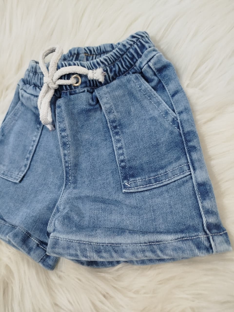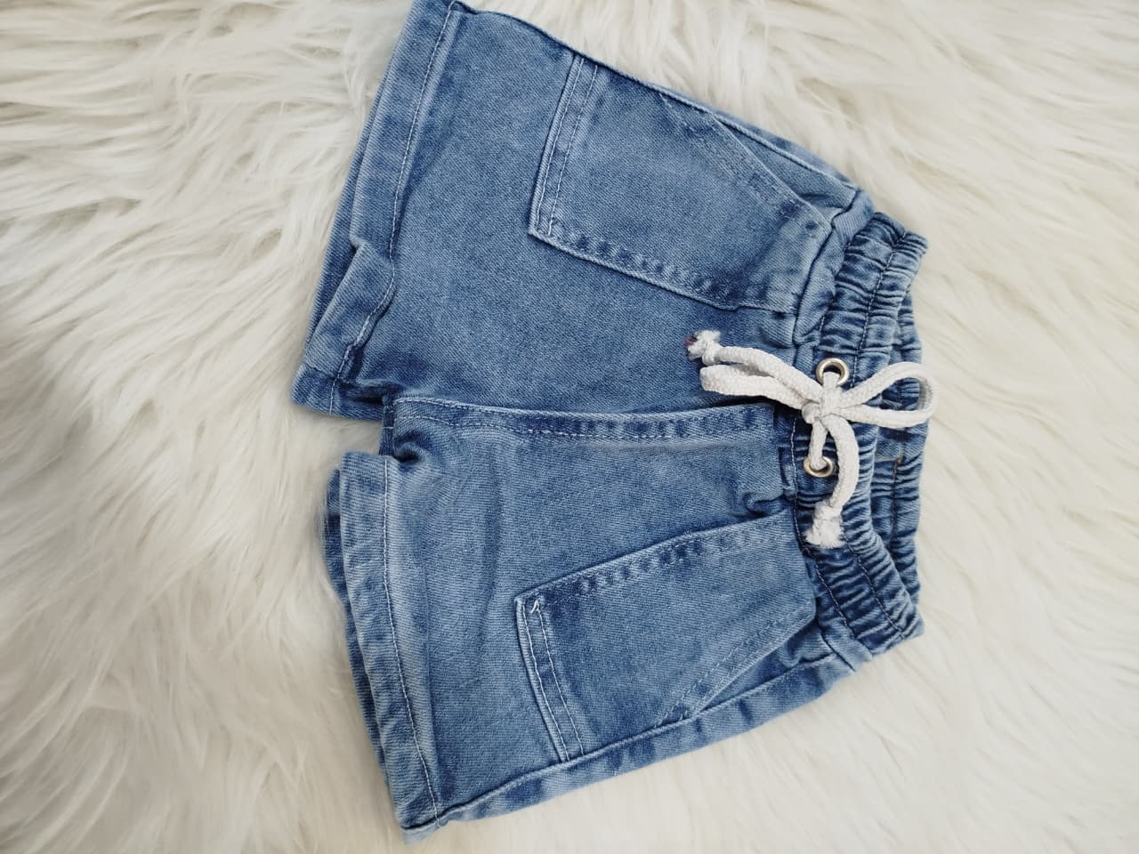 Bermuda de jean elastizado con cintura elastizada y cordón. Bolsillos laterales y en la parte de atras.