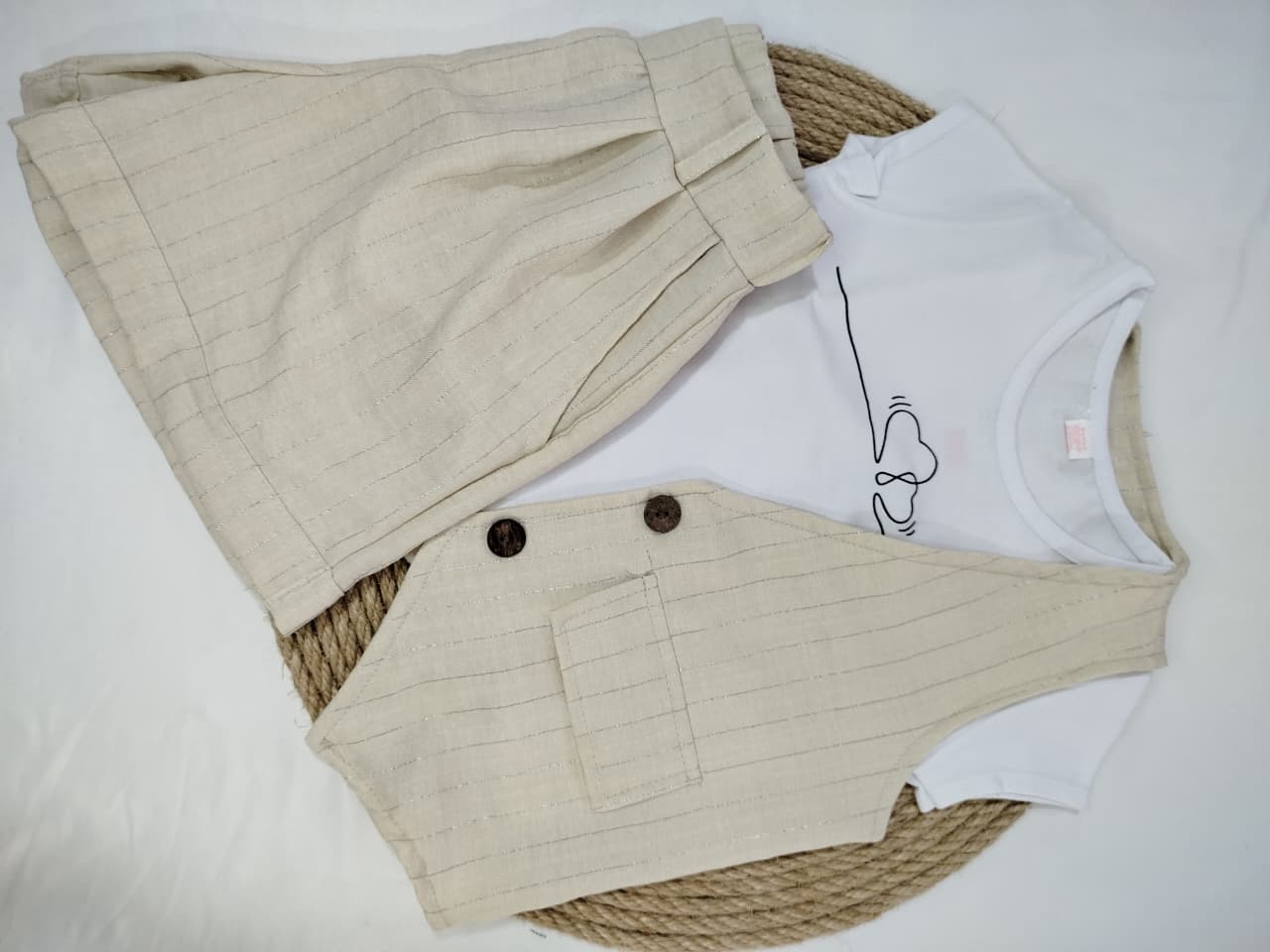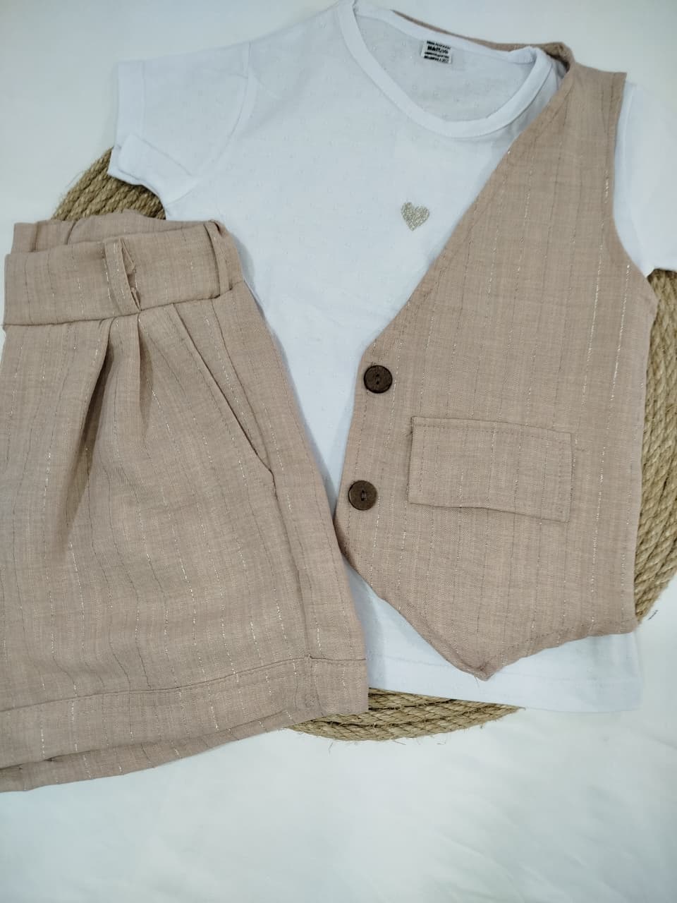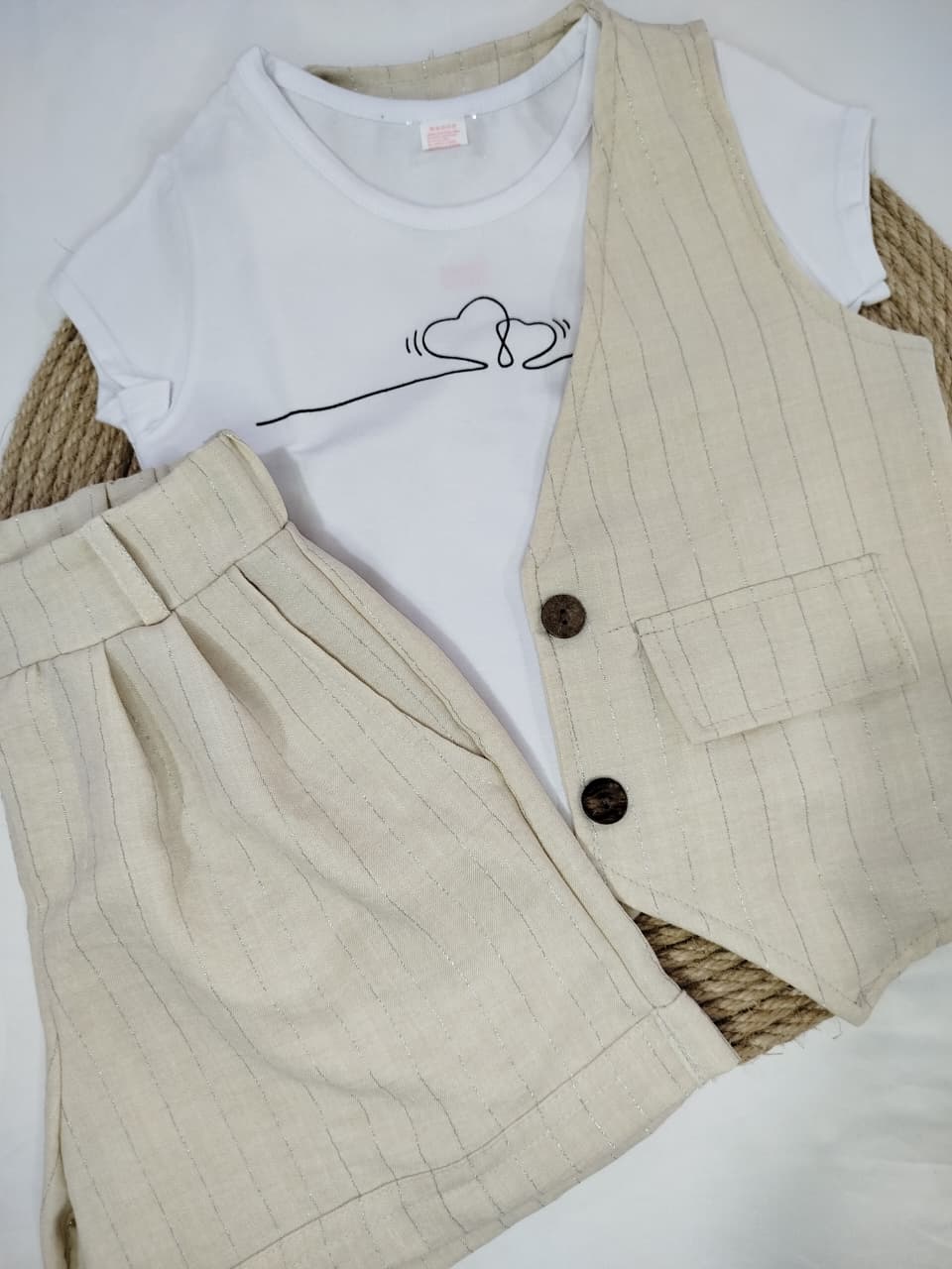 Conjunto sastrero de short con chaleco. Short con bolcillos y cintura elastizada. Chaleco con tapa de bolsillo ciego, botones de madera.