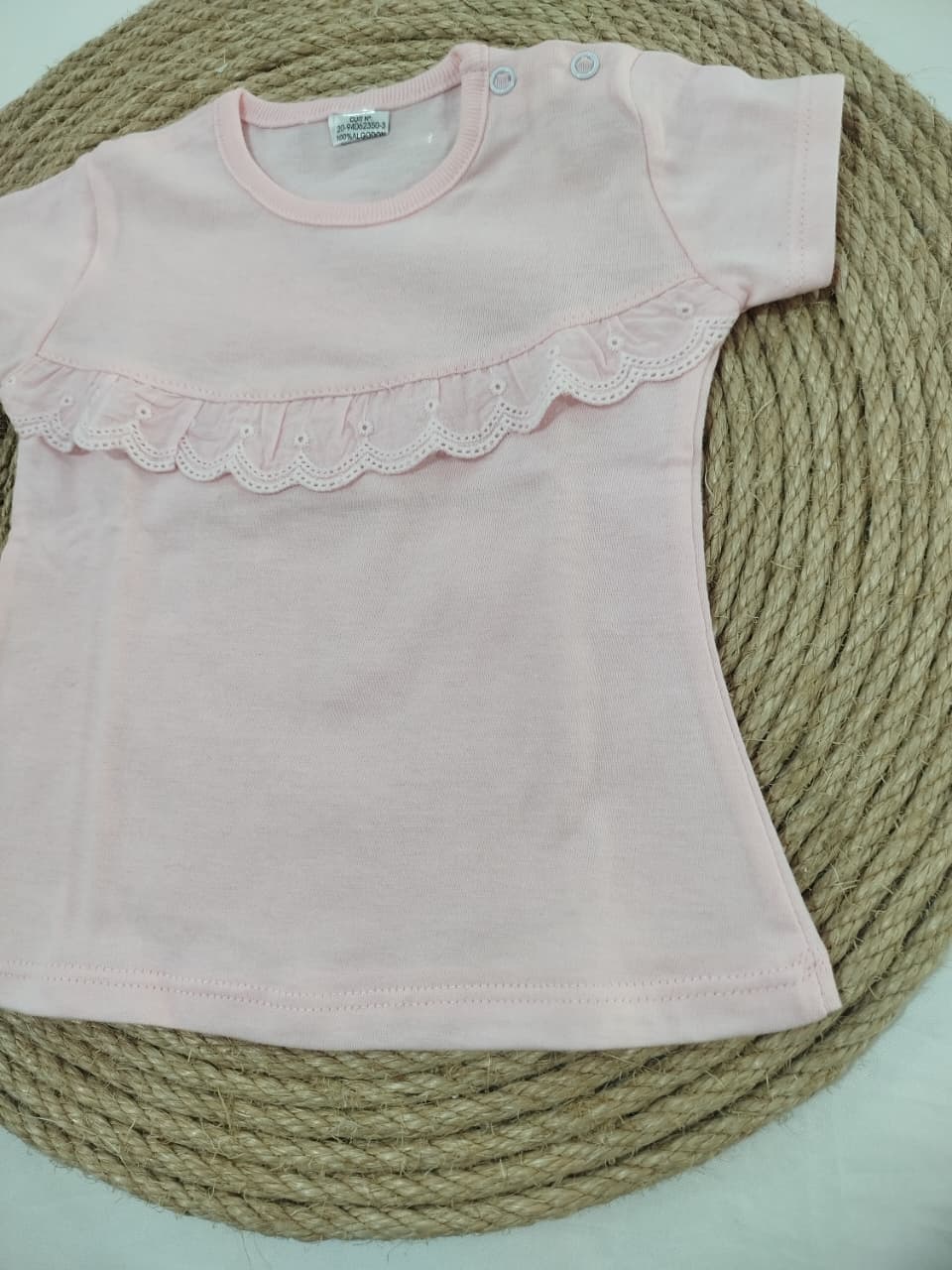 Remera mangas corta de algodón, con volado de broderie en pechera.