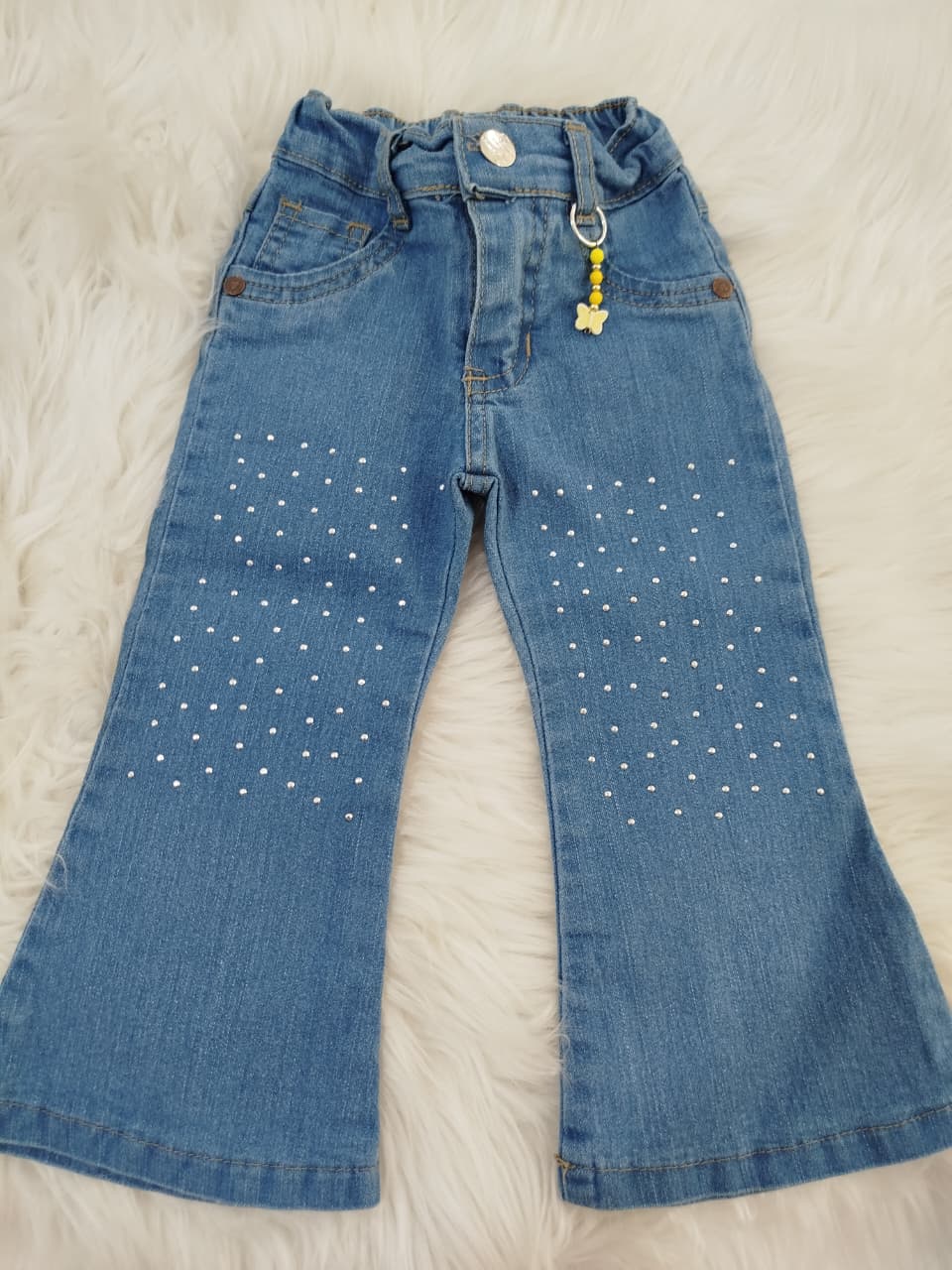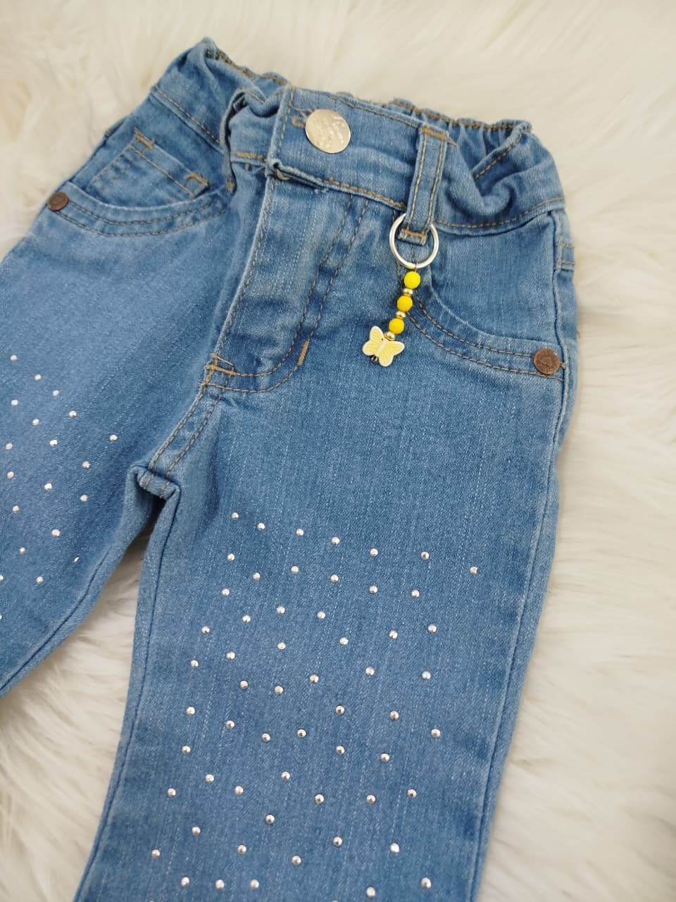 Jean oxford con strass. Parte de atras de la cintura elastizada. Con detalle colgante en el pasa cinto.