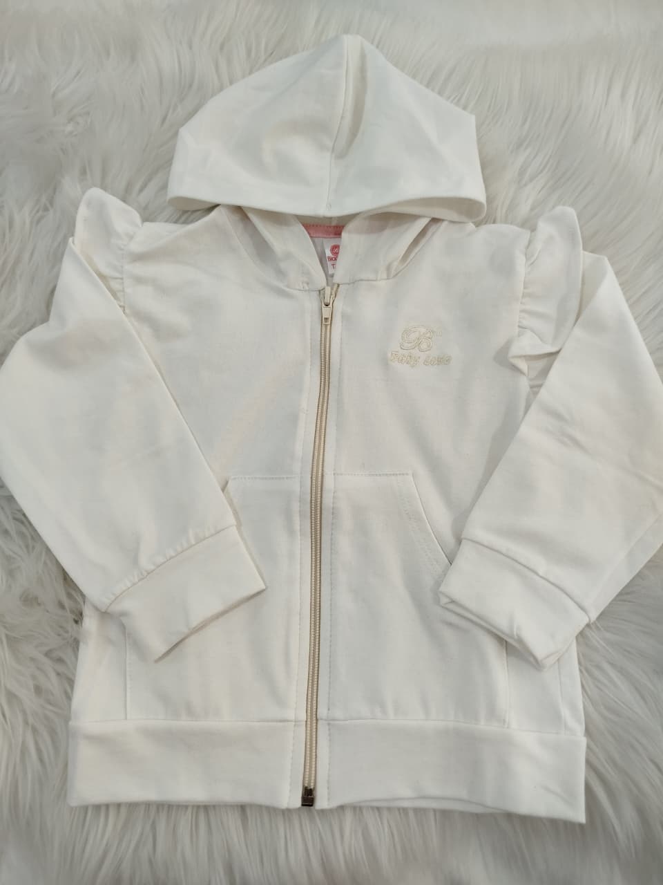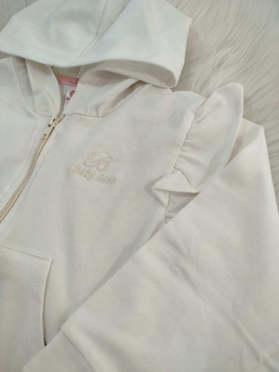 Campera de algodón con capucha, bolsillos y volado en los hombros.