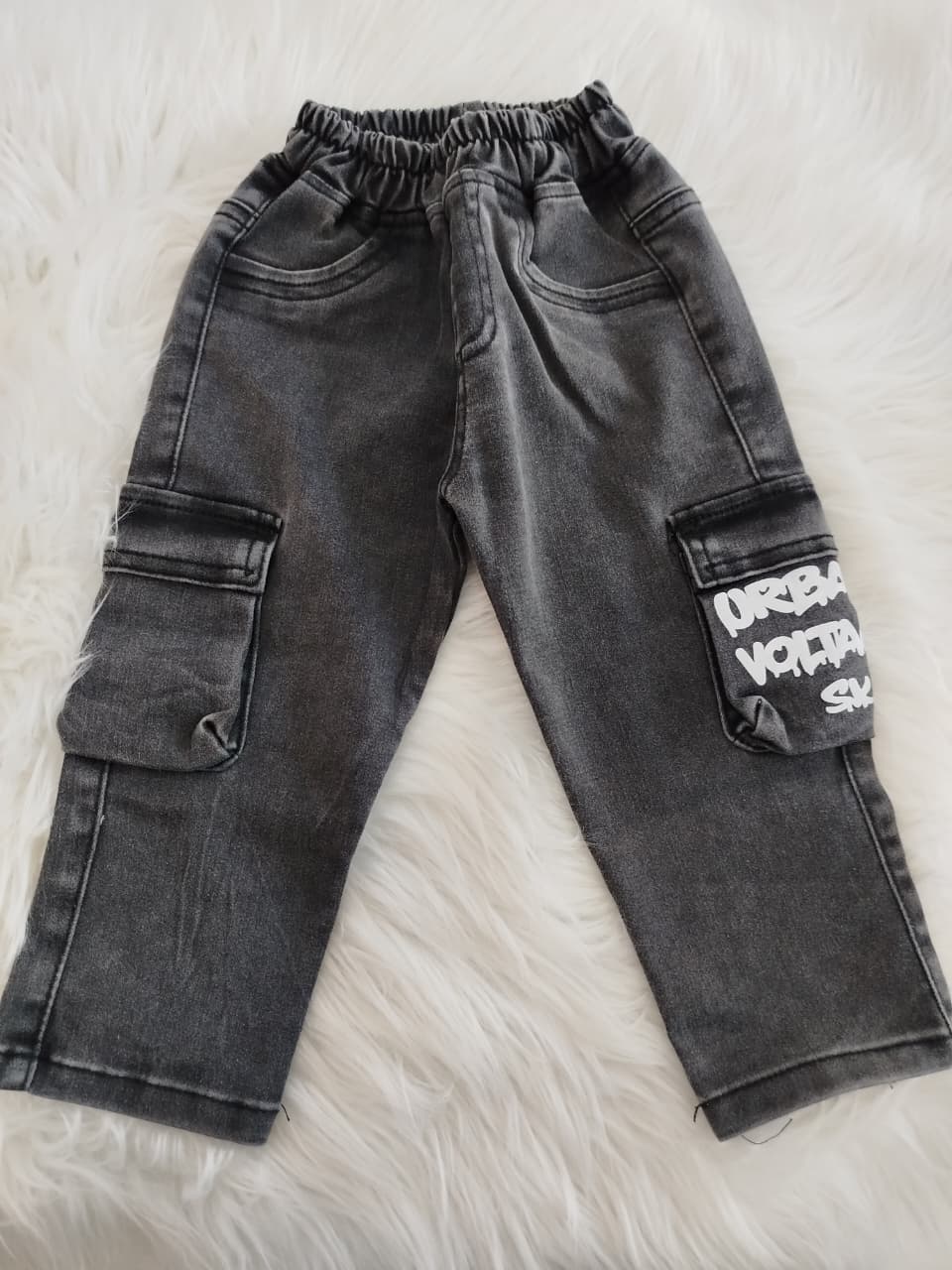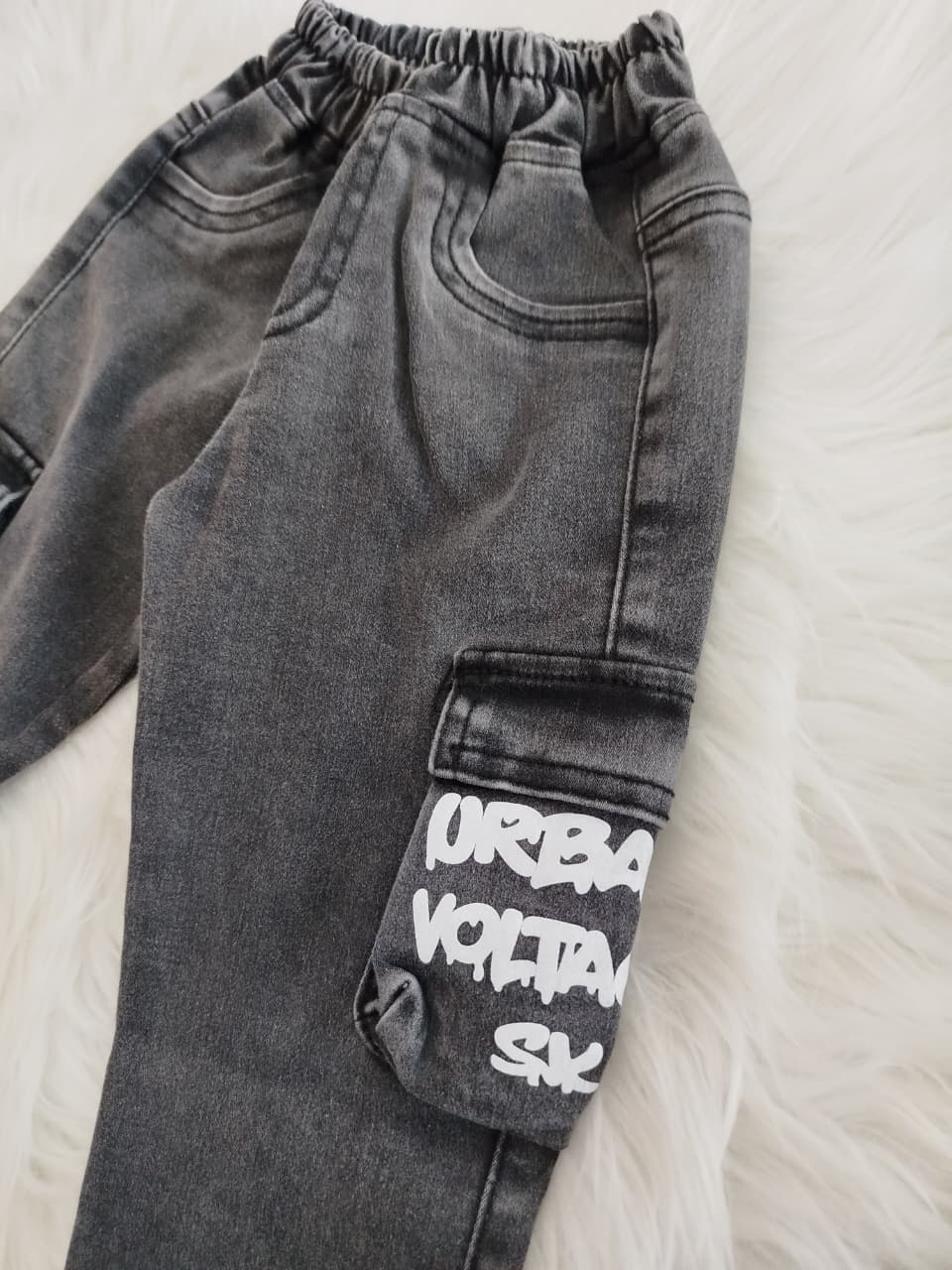 Jean cargo con cintura elastizada. Bolsillo con estampa.
