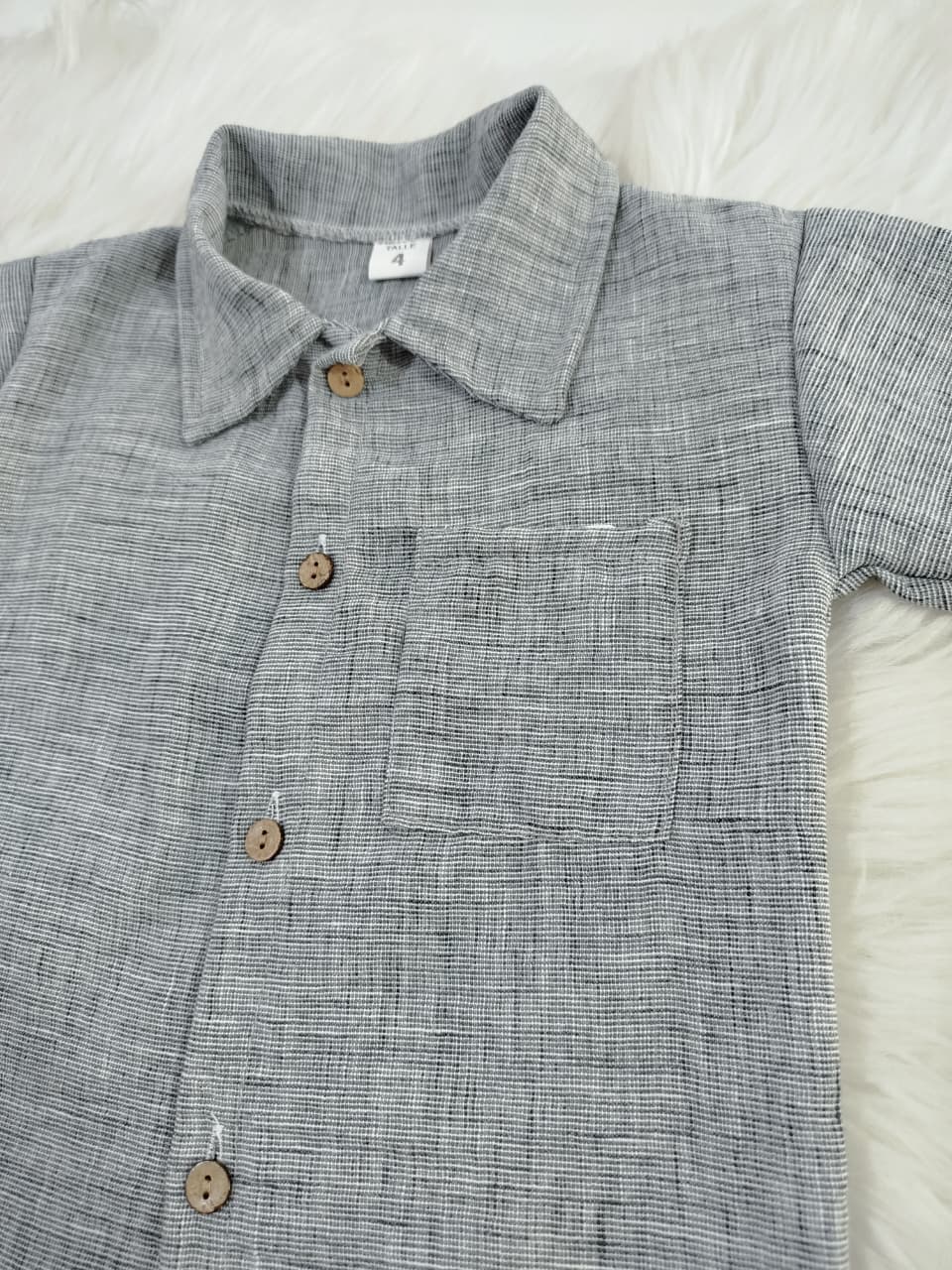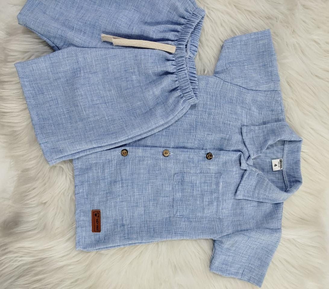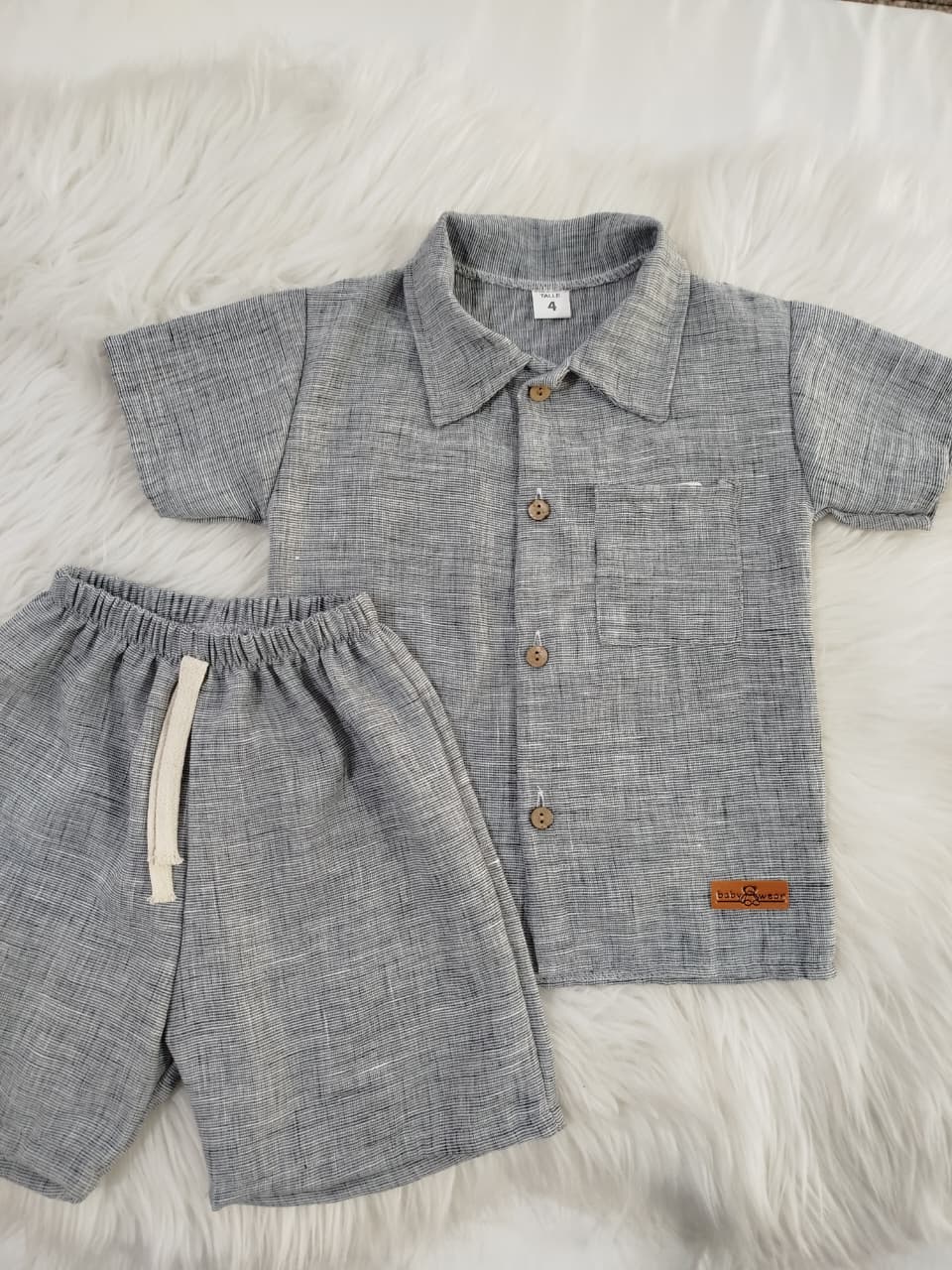 Conjunto de lino, camisa con botones de madera, bolsillo en pecho izquierzo. Short con cintura elastizada.