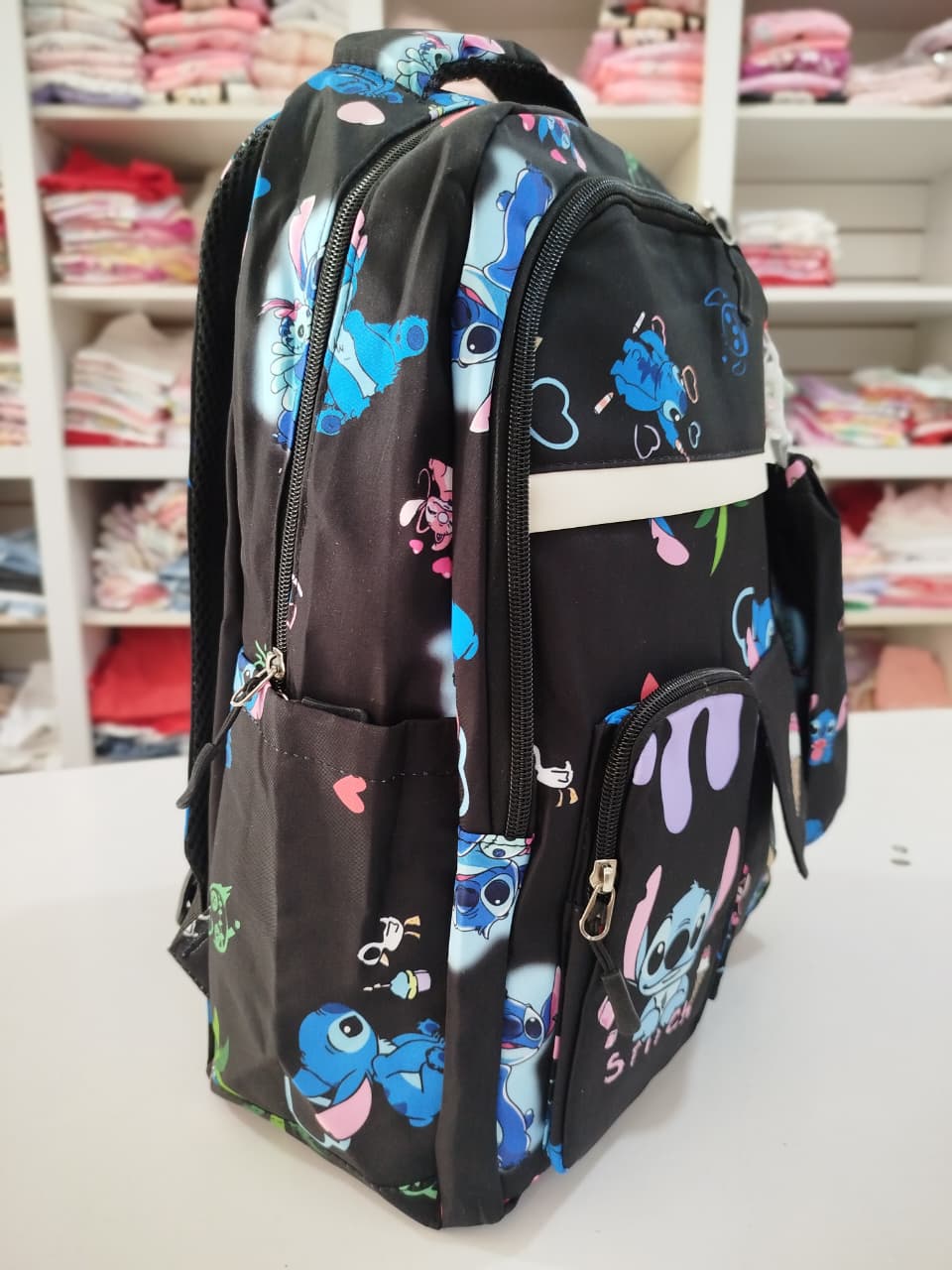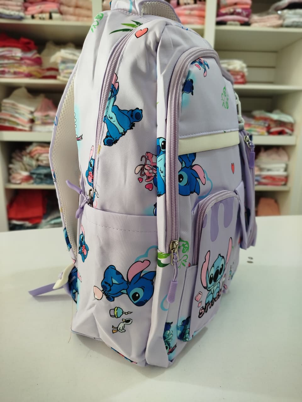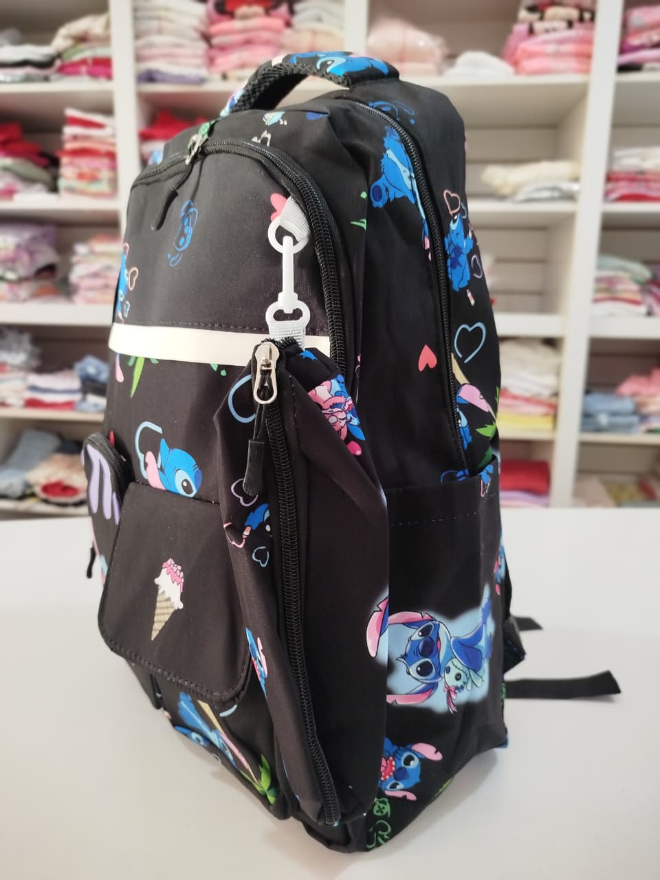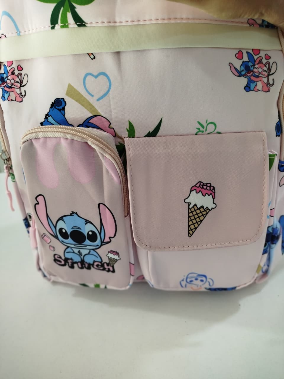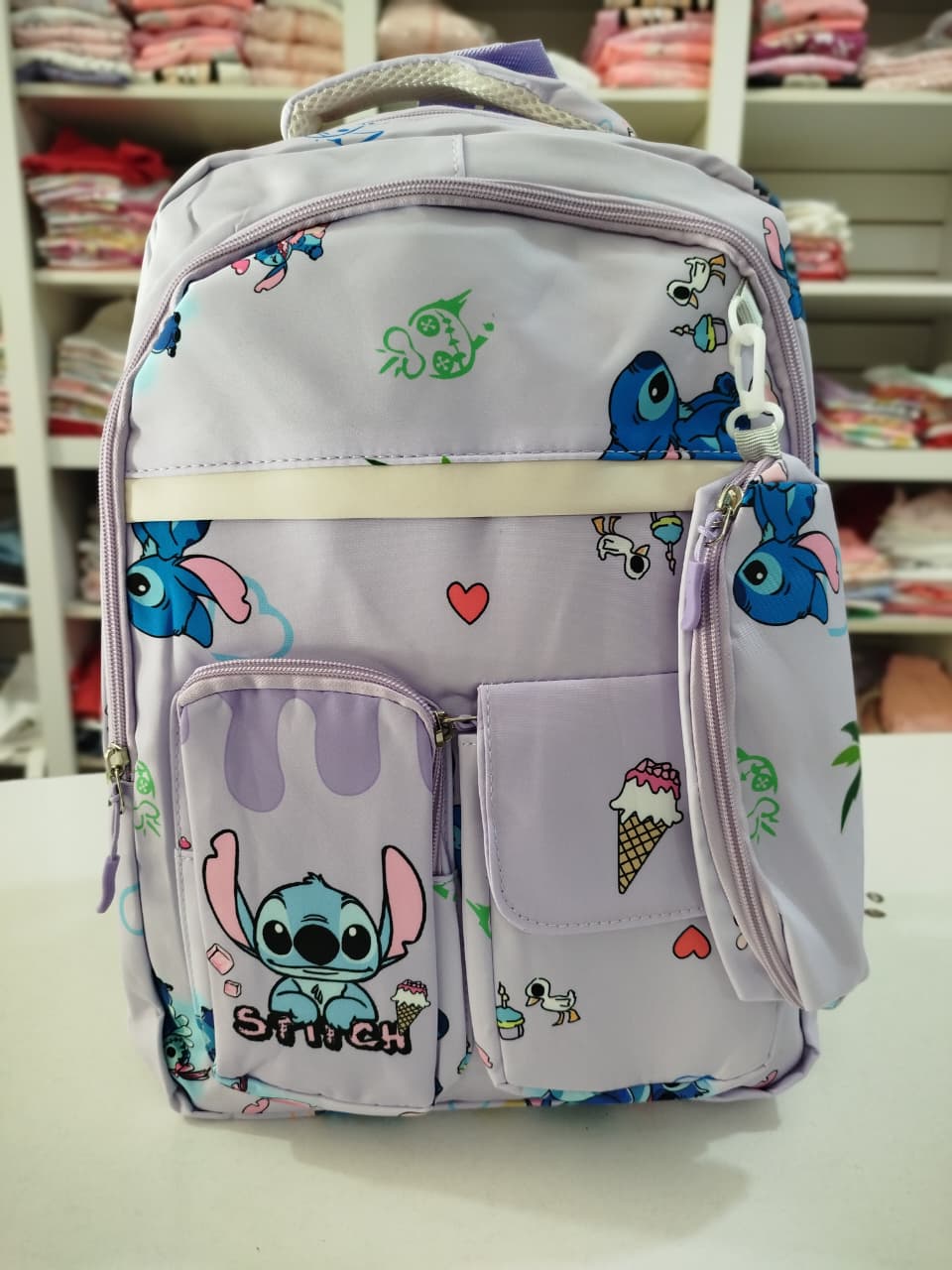 Mochila con estampa. Bolsillo principal y delantero. Dos bolsillos chicos delanteros, uno con abrojo y otro con cierre. Bolsillos laterales.