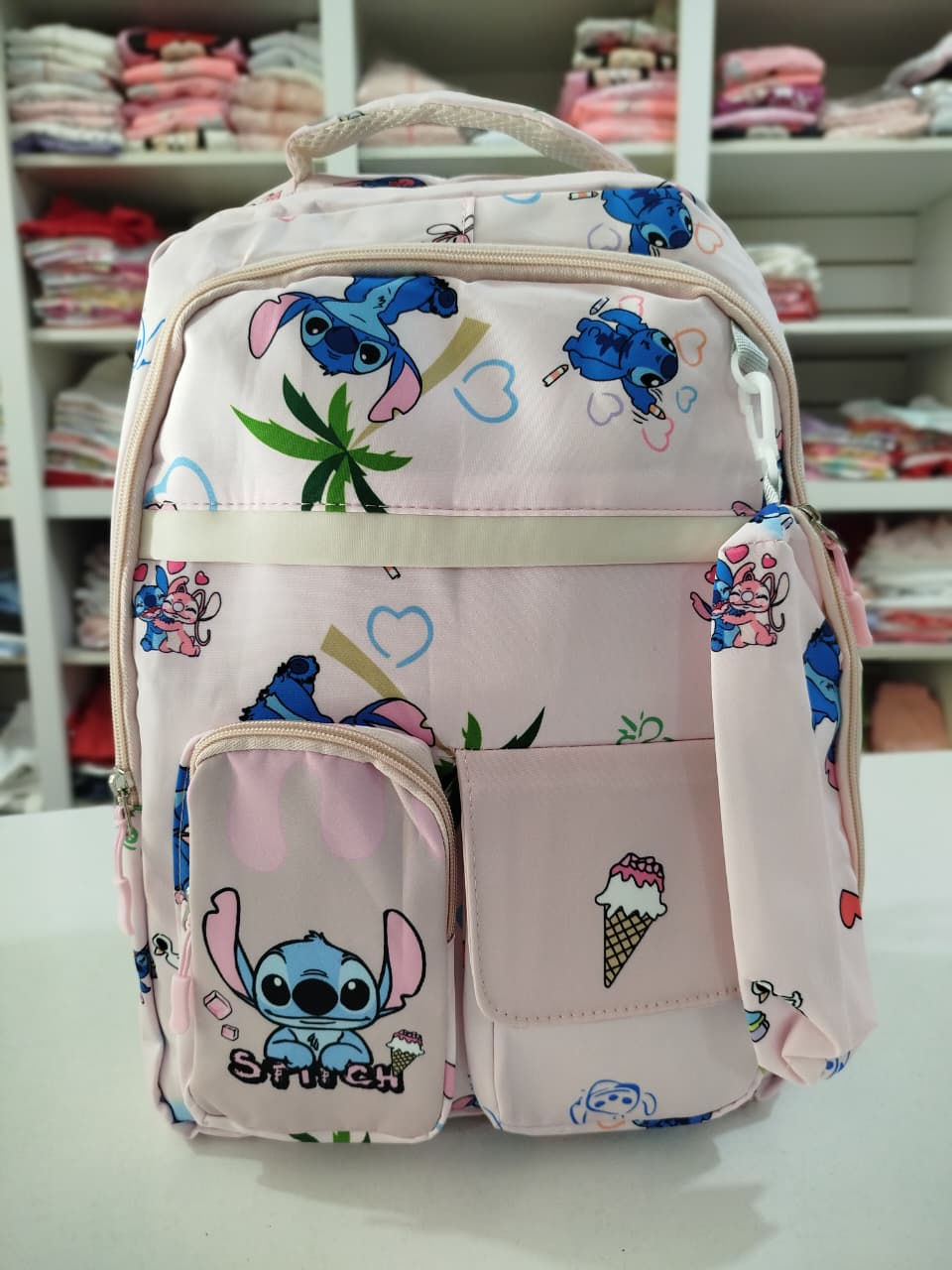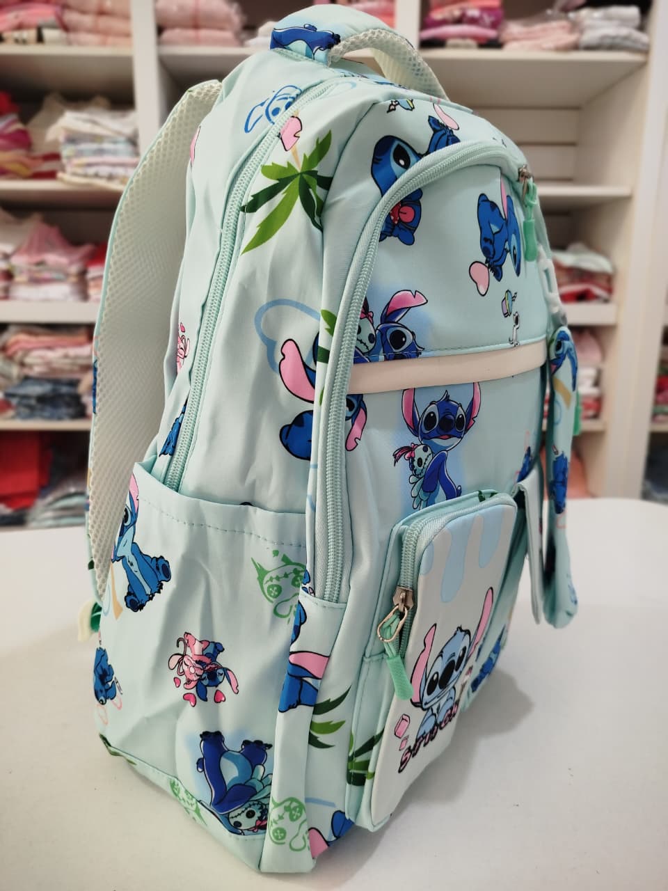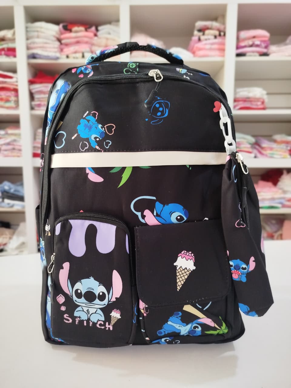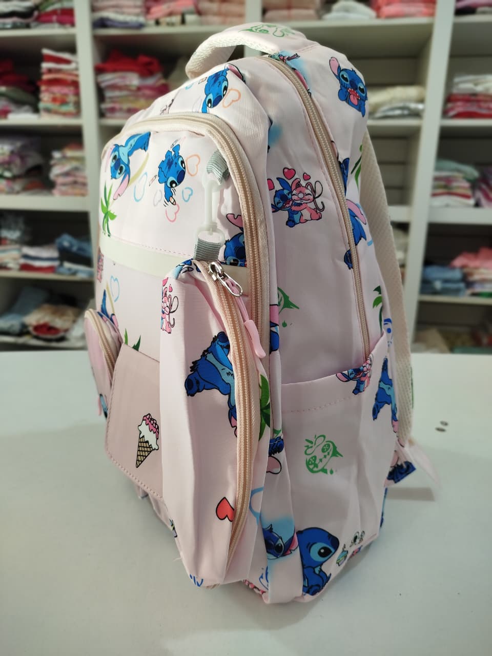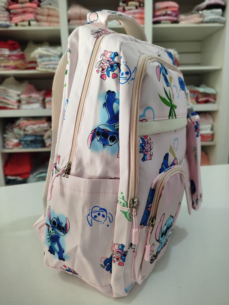 Mochila con estampa. Bolsillo principal y delantero. Dos bolsillos chicos delanteros, uno con abrojo y otro con cierre. Bolsillos laterales.