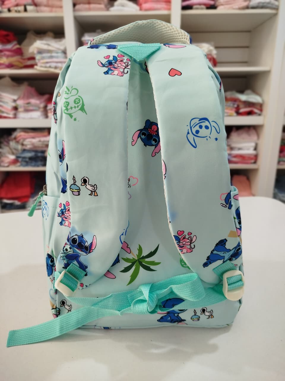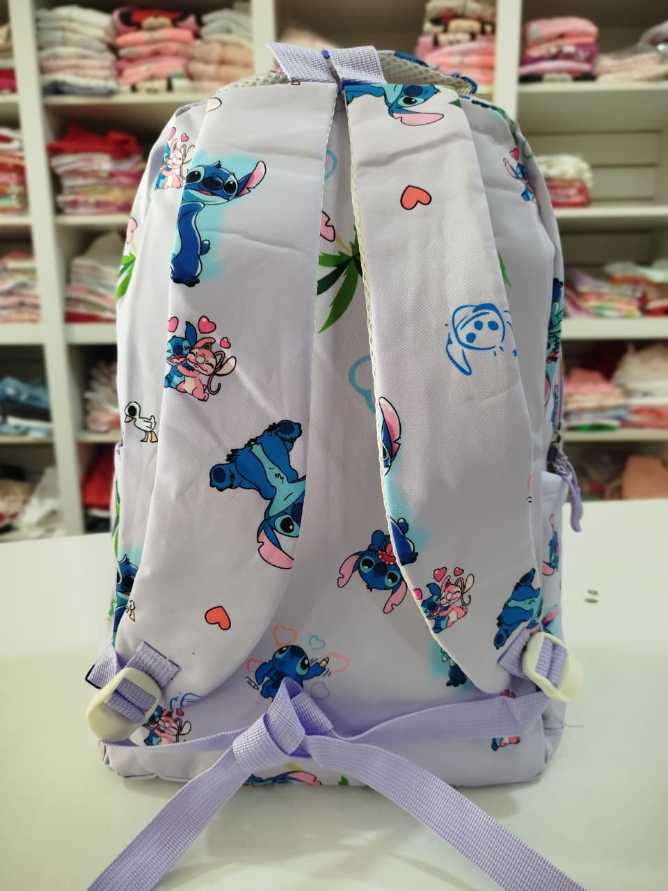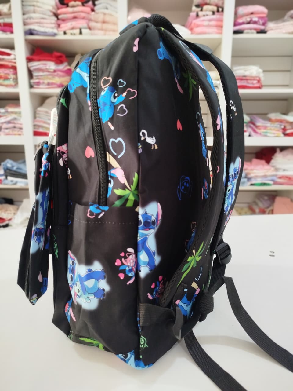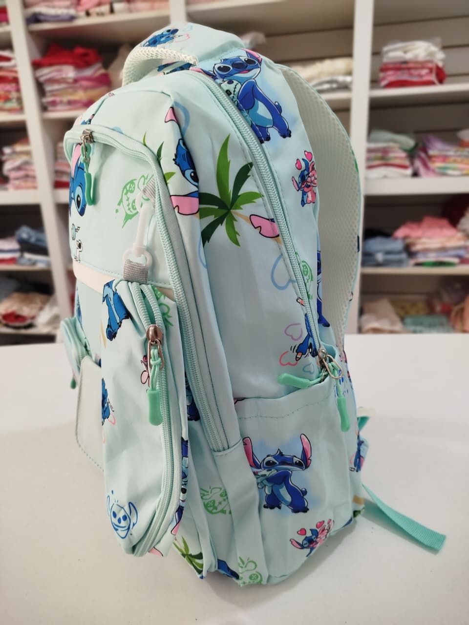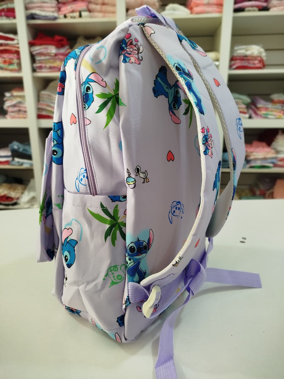 Mochila con estampa. Bolsillo principal y delantero. Dos bolsillos chicos delanteros, uno con abrojo y otro con cierre. Bolsillos laterales.