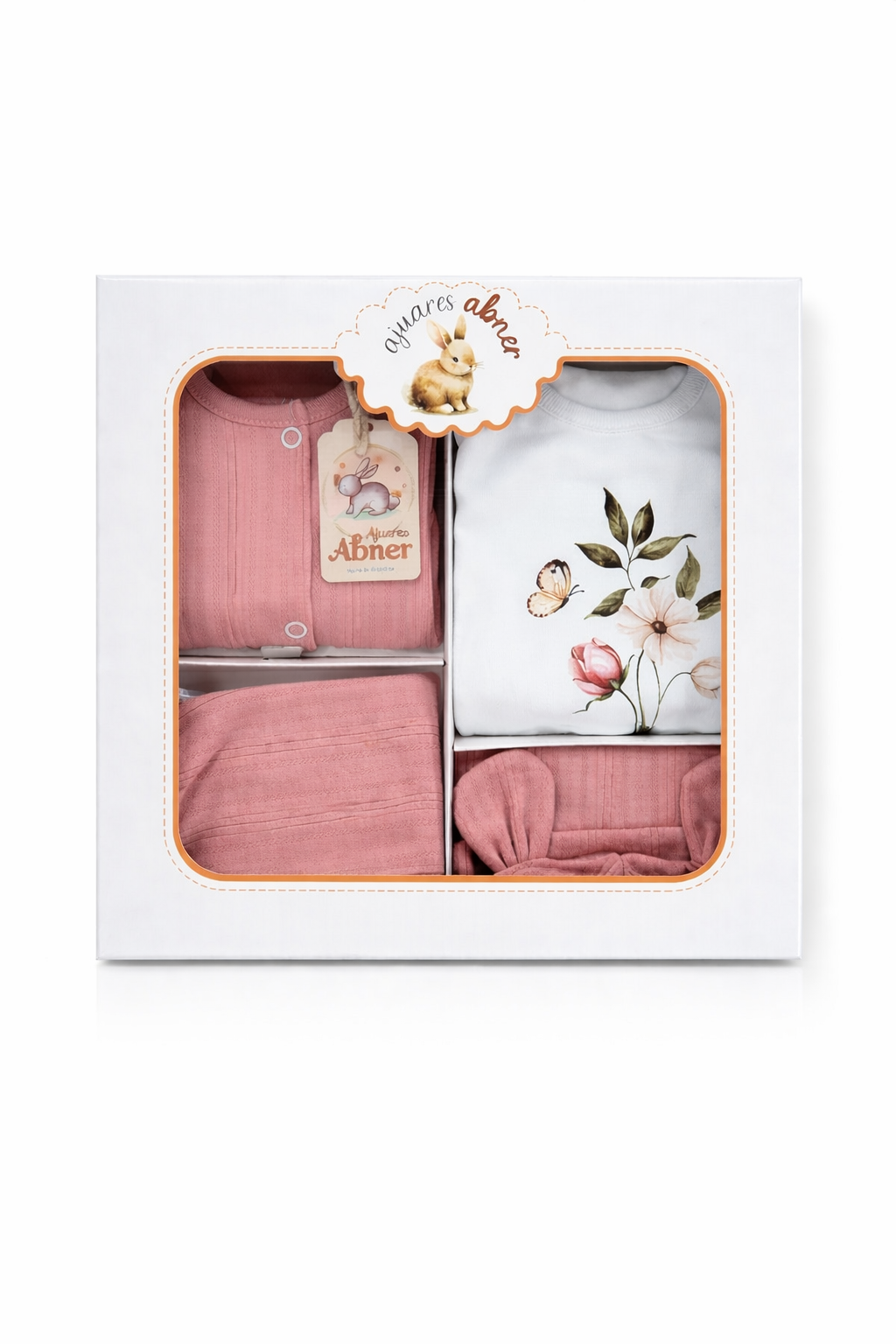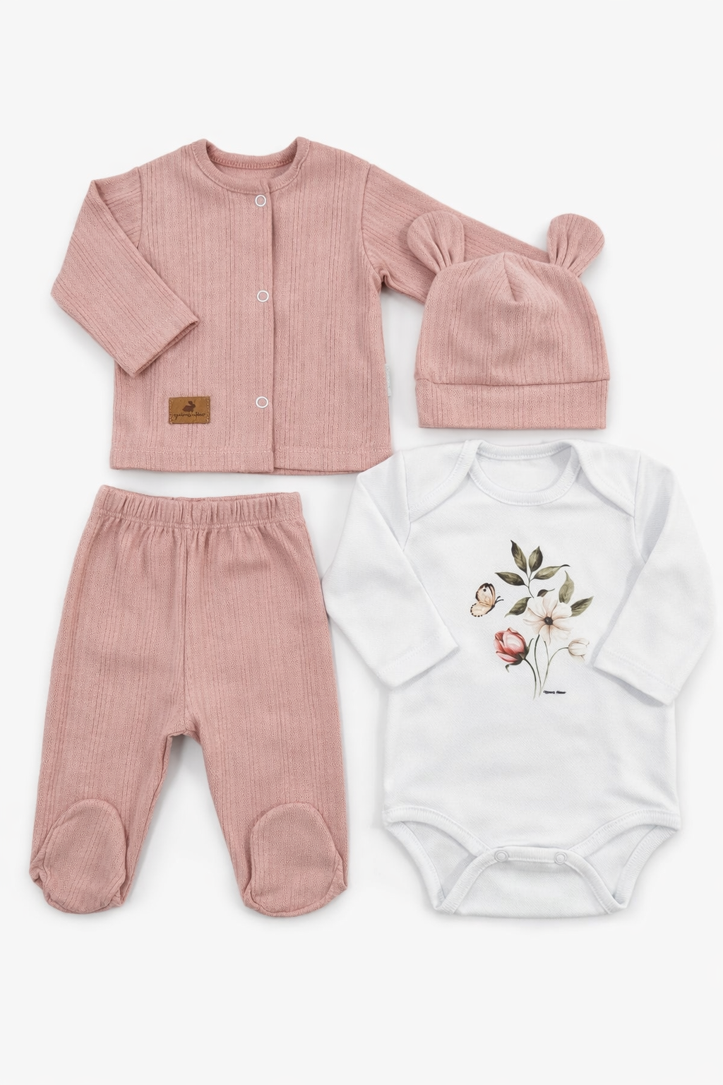 Ajuar de algodón, campera de algodón desagujado con broches, ranita con pie desagujado , gorrito desagujado y body mangas largas con estampa.