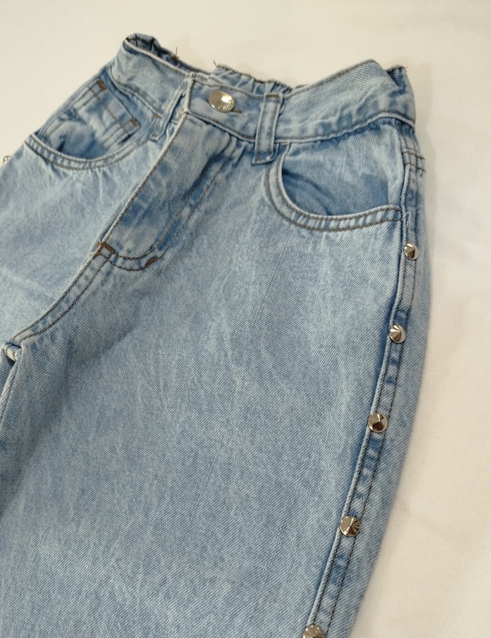 Jean wide leg, tachas en el costado de la pierna. Cintura elastizada en la parte trasera.